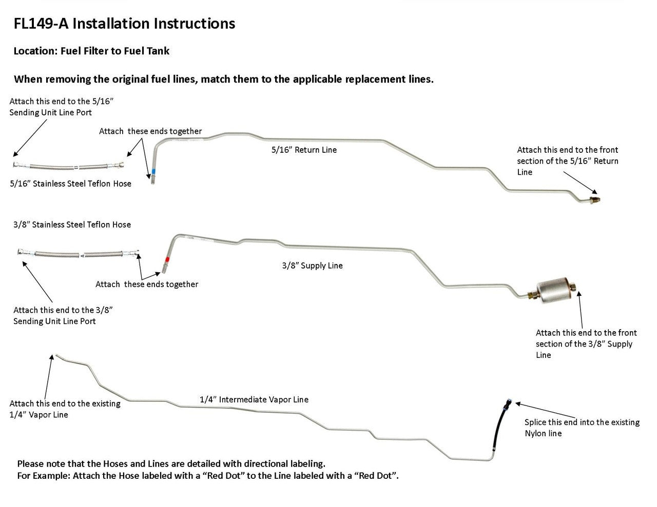 1 supply line 3/8", 1 return line 5/16", 1 intermediate vapor line 1/4", hoses to sending unit connection, 1 fuel filter