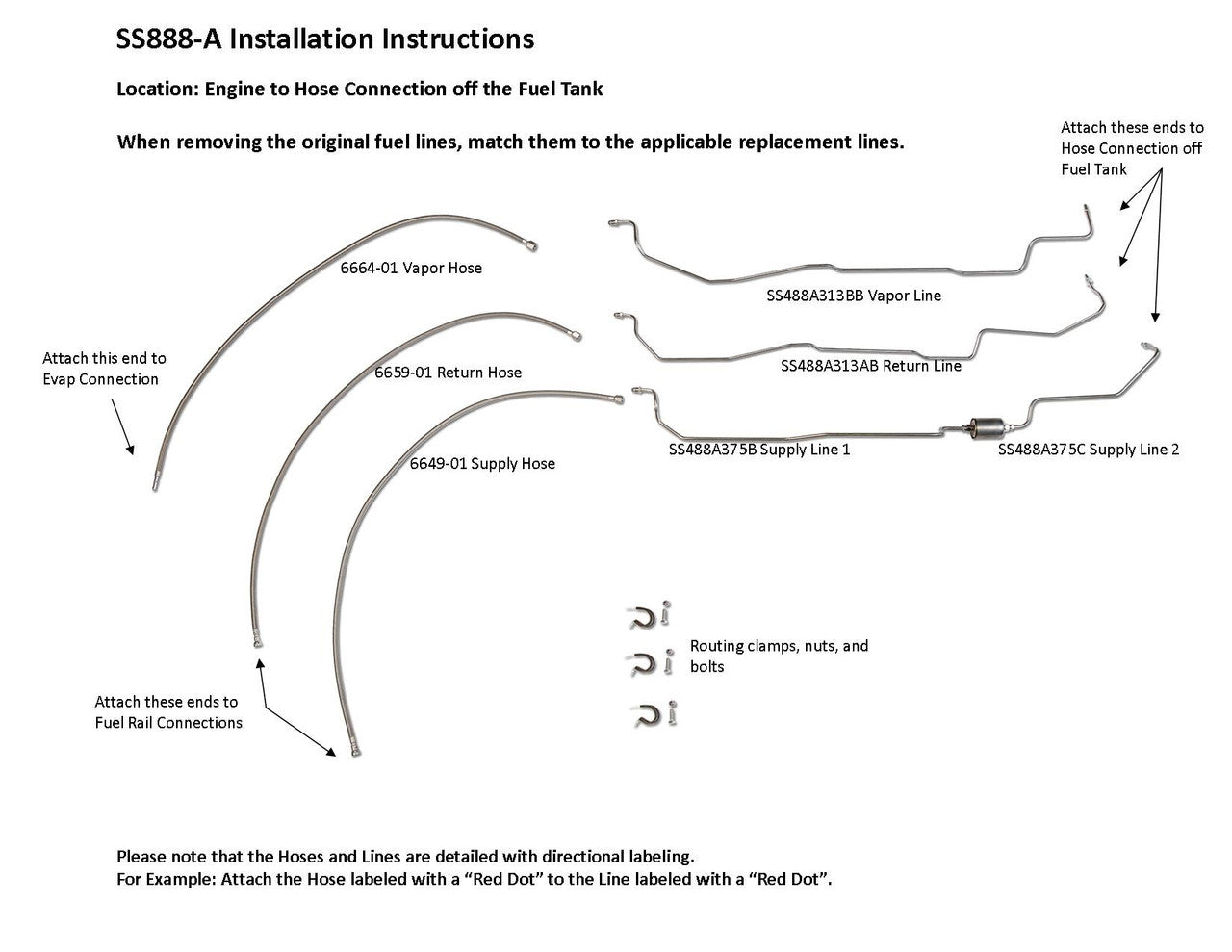 1 línea de suministro de 3/8" (líneas flexibles de teflón trenzado de acero inoxidable para una fácil instalación), 1 línea de retorno de 5/16" (líneas flexibles de teflón trenzado de acero inoxidable para una fácil instalación), 1 línea de vapor de 5/16" (líneas flexibles de teflón trenzado de acero inoxidable para una fácil instalación), mangueras para conexión a motor, mangueras para unir secciones trasera y delantera, 1 filtro de combustible, 3 abrazaderas, 3 pernos, 3 tuercas
