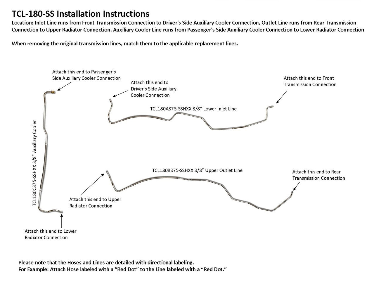 La línea de entrada va desde la conexión de transmisión delantera hasta la conexión del enfriador auxiliar del lado del conductor, la línea de salida va desde la conexión de transmisión trasera hasta la conexión del radiador superior, la línea del enfriador auxiliar va desde la conexión del enfriador auxiliar del lado del pasajero hasta la conexión del radiador inferior