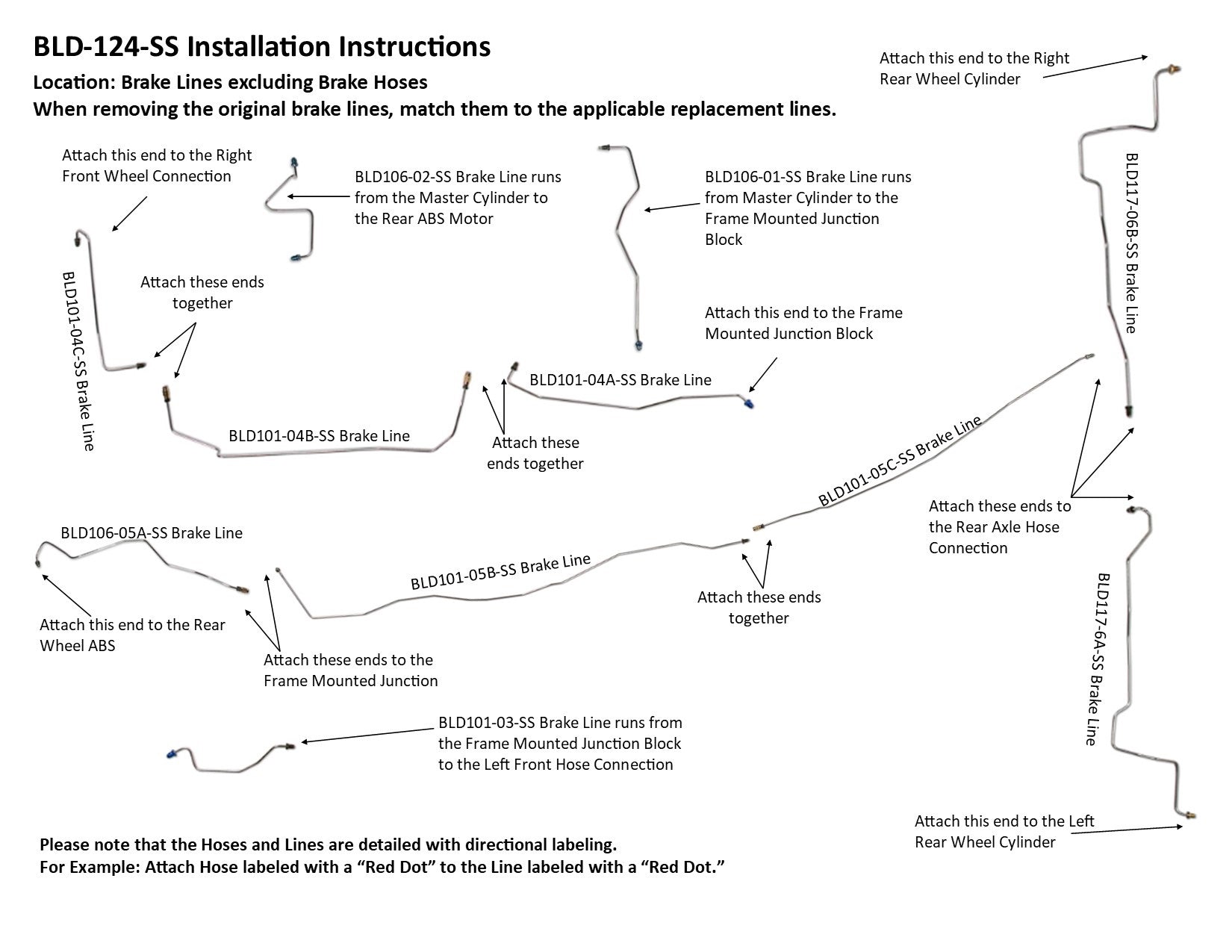 1 línea principal del cilindro maestro desde el cilindro maestro hasta el bloque de unión montado en el bastidor, 1 línea secundaria del cilindro maestro desde el cilindro maestro hasta el motor del ABS de la rueda trasera, 1 línea delantera izquierda desde el bloque de unión montado en el bastidor hasta la rueda delantera izquierda, 1 línea delantera derecha desde el bloque de unión montado en el bastidor hasta la rueda delantera derecha (3 secciones fáciles de instalar), 1 línea intermedia trasera desde el motor del ABS de la rueda trasera hasta el bloque de unión montado en el bastidor hasta la conexión de la manguera del eje trasero (3 secciones fáciles de instalar), 1 línea del eje trasero a lo largo de la parte superior del eje trasero (2 secciones)