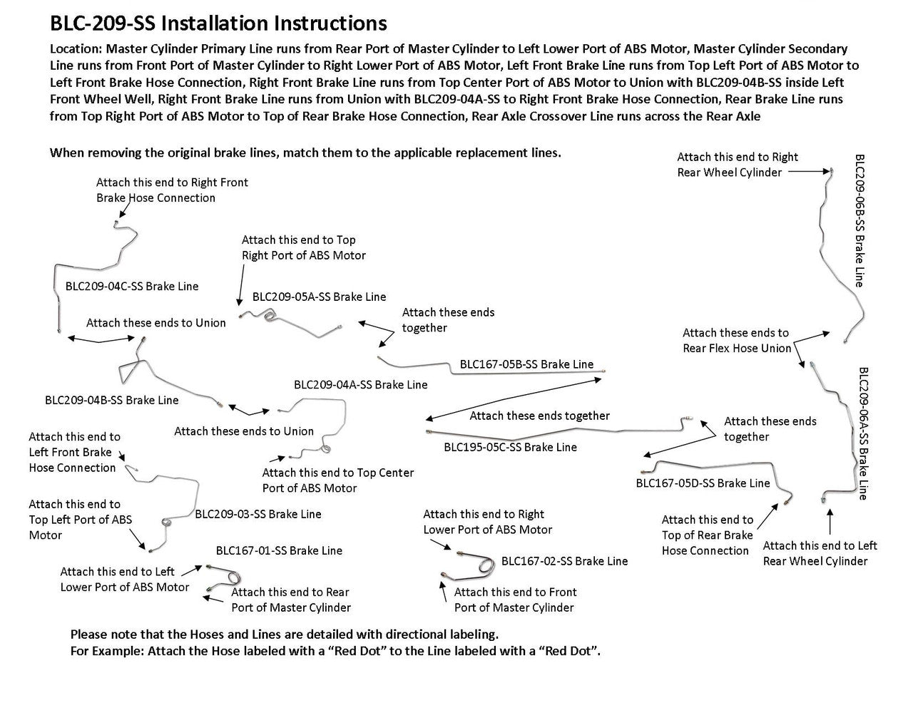 1 línea de freno principal del cilindro maestro de 3/16", 1 línea de freno secundario del cilindro maestro de 1/4", 1 línea de freno delantero izquierdo de 3/16", 1 línea de freno delantero derecho de 3/16 (en 3 secciones fáciles de instalar), 1 línea de freno trasero de 1/4" (en 4 secciones fáciles de instalar), 1 línea de cruce del eje trasero de 3/16" (2 secciones), NO incluye mangueras de freno