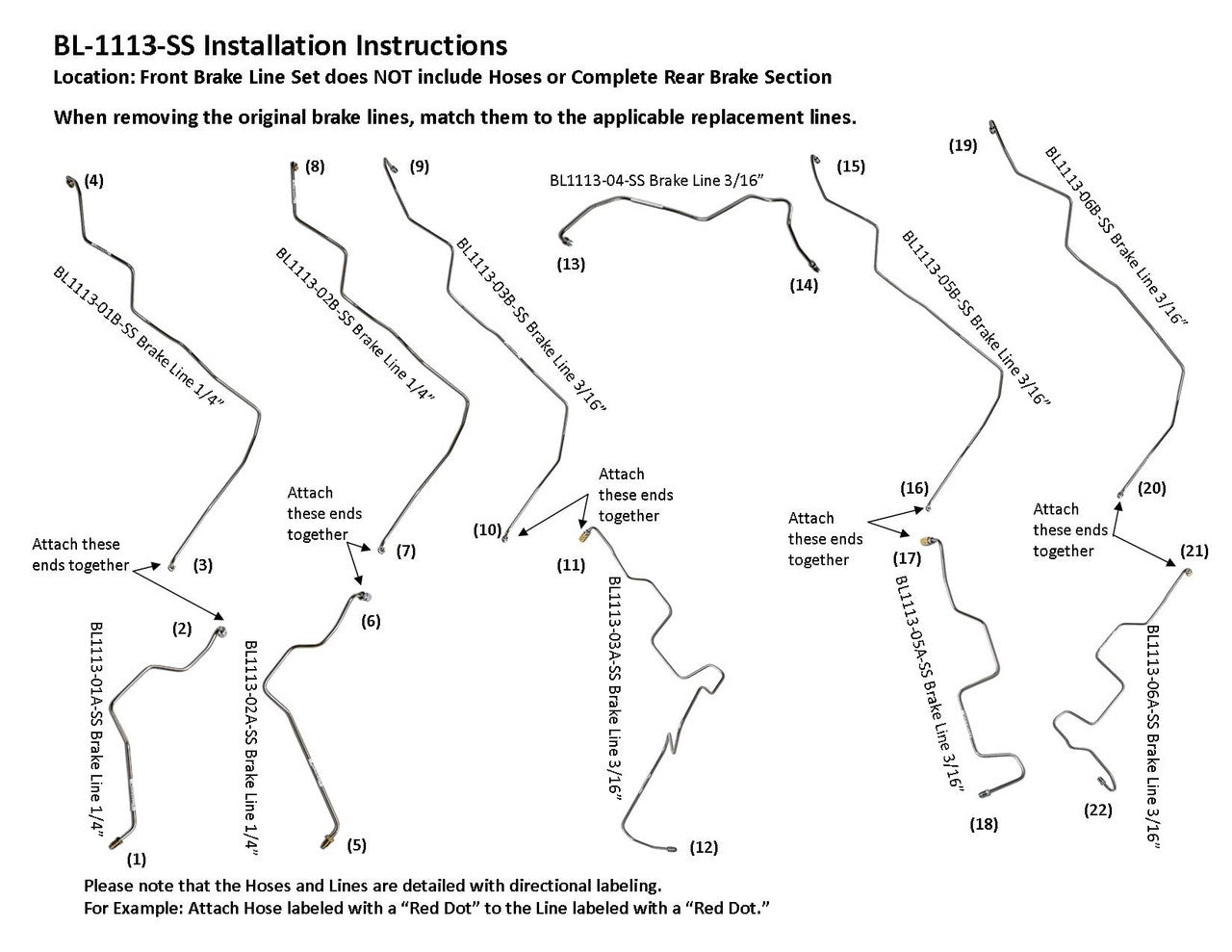 1 línea de freno principal del cilindro maestro de 1/4" (en 2 secciones fáciles de instalar), 1 línea de freno secundario del cilindro maestro de 1/4" (en 2 secciones fáciles de instalar), 1 línea de freno delantero izquierdo de 3/16" (en 2 secciones fáciles de instalar), 1 línea de freno delantero derecho de 3/16", 1 línea de freno trasero izquierdo de 3/16" (en 2 secciones fáciles de instalar), 1 línea de freno trasero derecho de 3/16" (en 2 secciones fáciles de instalar), NO incluye mangueras de freno ni sección completa de freno trasero