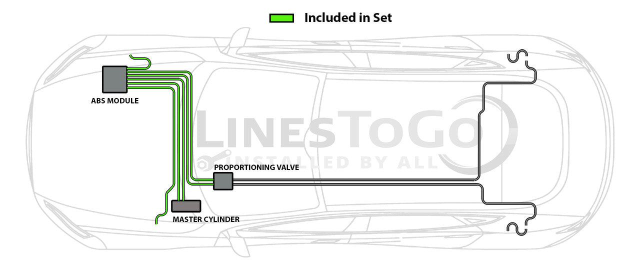 Juego de líneas de freno delantero: la línea principal del cilindro maestro va desde la parte trasera del cilindro maestro hasta la parte superior del motor del ABS, la línea secundaria del cilindro maestro va desde la parte delantera del cilindro maestro hasta la parte superior del motor del ABS, la línea del freno delantero izquierdo va desde el motor del ABS hasta la conexión de la manguera delantera izquierda, la línea del freno delantero derecho va desde el motor del ABS hasta la conexión de la manguera delantera derecha, la línea del freno trasero izquierdo va desde el motor del ABS hasta la válvula dosificadora, la línea del freno trasero derecho va desde el motor del ABS hasta la válvula dosificadora