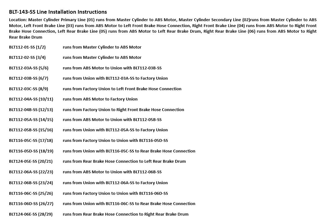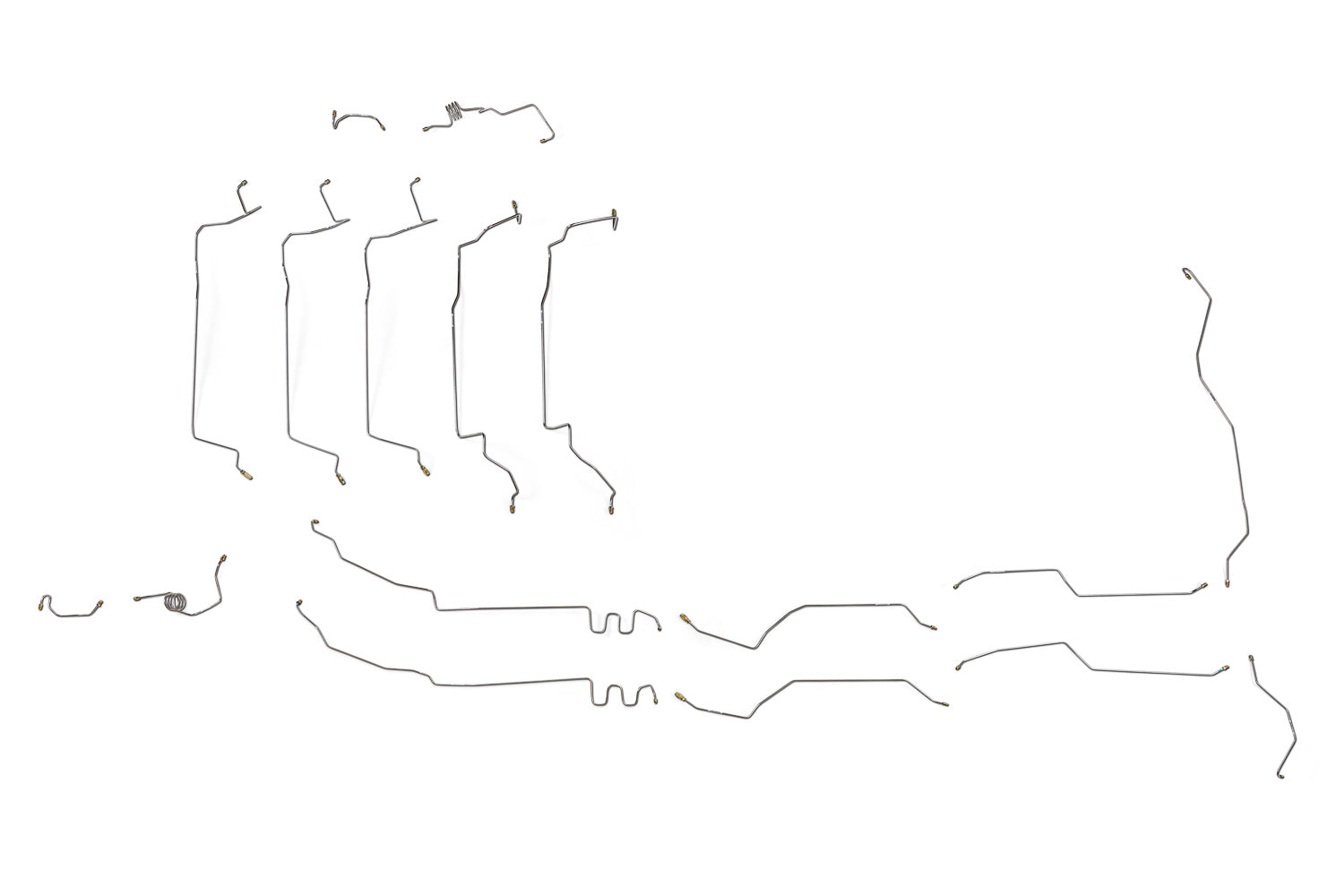 1 línea de freno principal del cilindro maestro de 1/4", 1 línea de freno secundario del cilindro maestro de 1/4", 1 línea de freno delantero izquierdo de 3/16" (en 2 secciones fáciles de instalar), 1 línea de freno delantero derecho de 3/16", 2 líneas de freno trasero izquierdo de 3/16" (en 4 secciones fáciles de instalar), 2 líneas de freno trasero derecho de 3/16" (en 4 secciones fáciles de instalar), NO incluye mangueras de freno