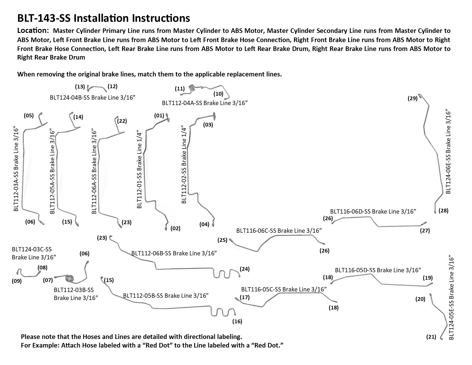 Tenga en cuenta:Antes de instalar la línea de freno, se deben quitar los codos de envío de las líneas etiquetadas BLT112-05B-SS y BLT112-06B-SS. Vea el video a continuación sobre cómo quitar el codo de envío