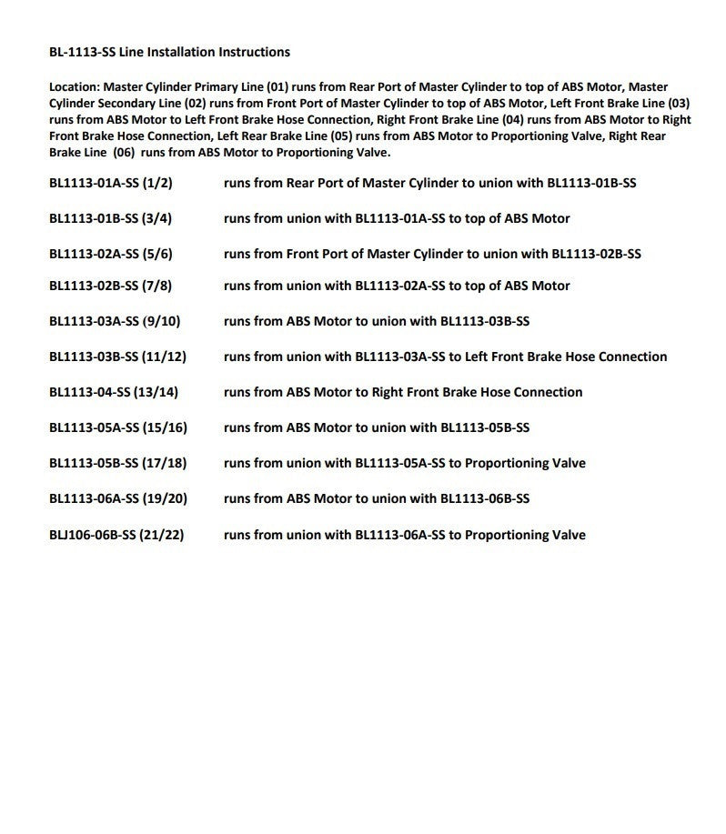 1 conduite de frein primaire de maître-cylindre 1/4" (en 2 sections faciles à installer), 1 conduite de frein secondaire de maître-cylindre 1/4" (en 2 sections faciles à installer), 1 conduite de frein avant gauche 3/16" (en 2 sections faciles à installer), 1 conduite de frein avant droite 3/16", 1 conduite de frein arrière gauche 3/16" (en 2 sections faciles à installer), 1 conduite de frein arrière droite 3/16" (en 2 sections faciles à installer), N'inclut PAS les flexibles de frein ni la section complète de frein arrière
