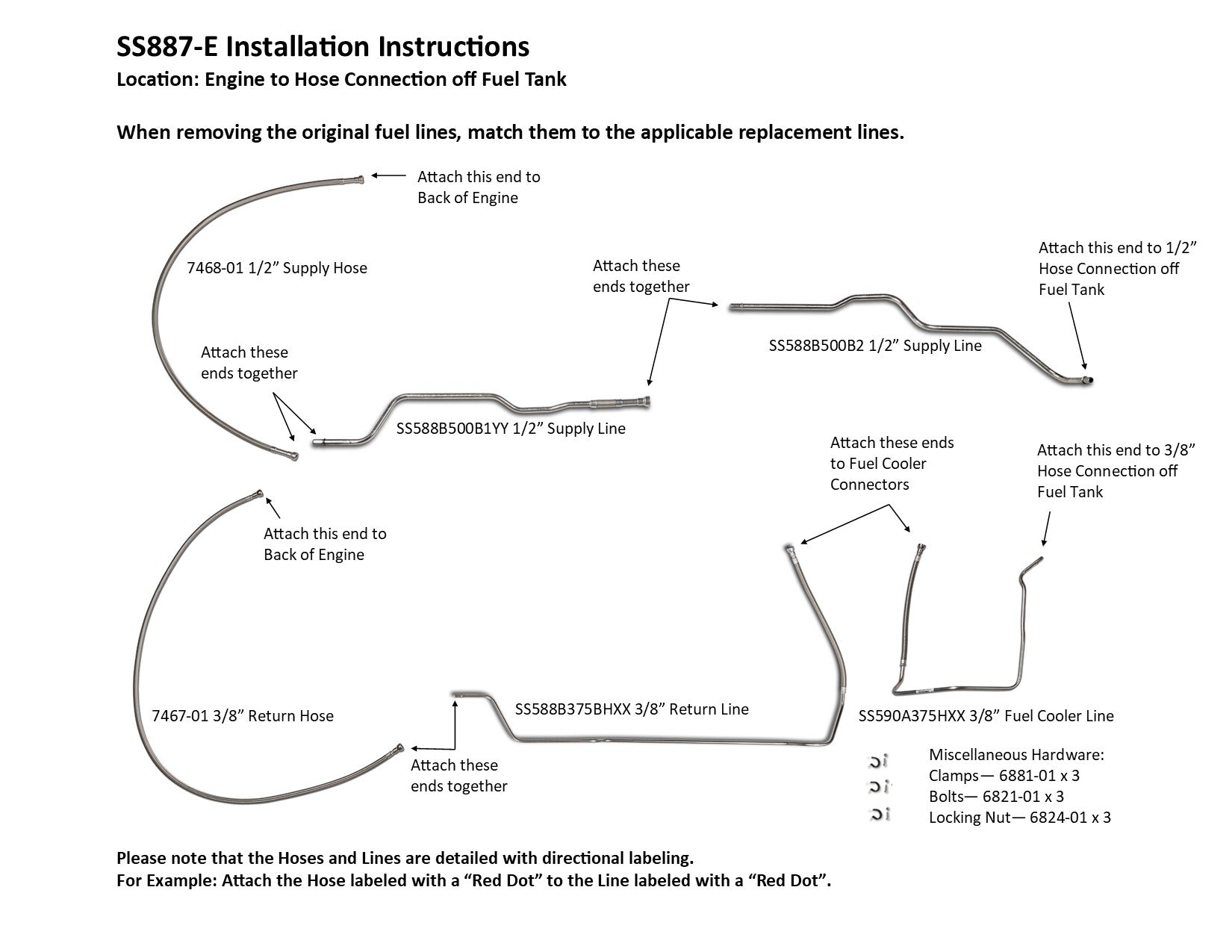 Inclus dans l'ensemble : 1 tuyau d'alimentation 1/2" (tuyau flexible en téflon tressé en acier inoxydable pour une installation facile), 1 conduite d'alimentation 1/2" (en 2 sections faciles à installer), 1 tuyau de retour 3/8" (tuyau flexible en téflon tressé en acier inoxydable pour une installation facile), 1 conduite de retour 3/8", 1 conduite de refroidisseur de carburant 3/8", tuyaux de raccordement au refroidisseur de carburant, 3 boulons, 3 colliers de serrage, 3 écrous, 1 raccord union