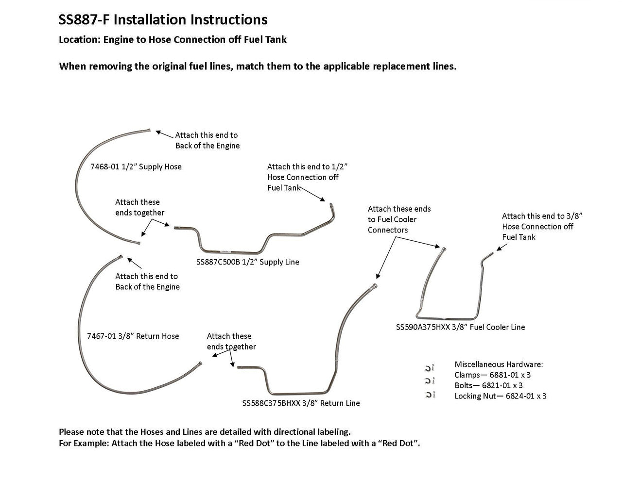 Non inclus dans l'ensemble : tuyaux entre la conduite de carburant et le réservoir de carburant 5069-01 et conduites de connexion du refroidisseur FL591-A1 ou SS591-A1 . Ces pièces sont disponibles à l'achat séparément.