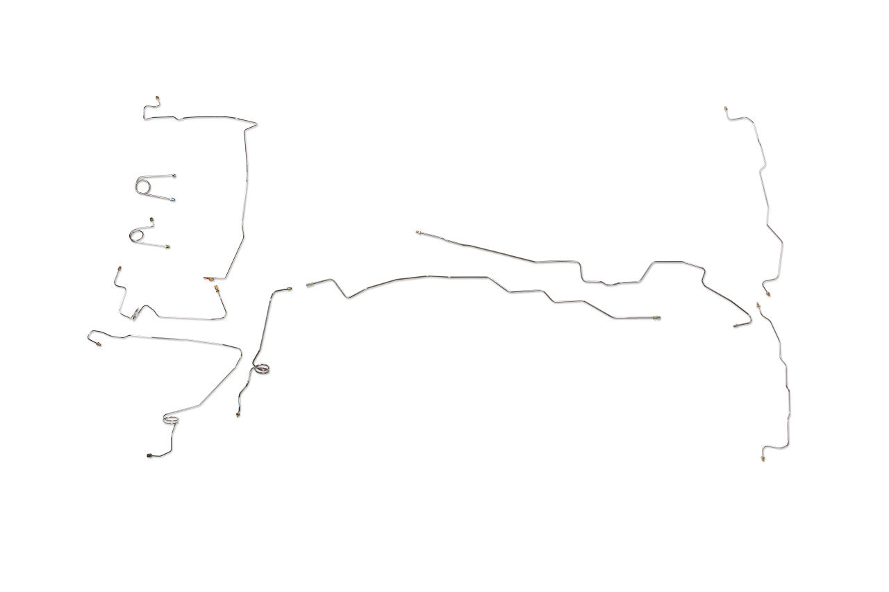 1 conduite primaire 3/16" du maître-cylindre à l'ABS, 1 conduite secondaire 1/4" du maître-cylindre à l'ABS, 1 conduite avant gauche 3/16" du moteur ABS au raccord de tuyau de roue avant gauche, 1 conduite avant droite 3/16" du moteur ABS au raccord de roue avant droite (2 sections), 1 conduite 1/4" du moteur ABS au raccord de tuyau d'essieu arrière (3 sections), 1 conduite d'essieu arrière 3/16" (2 sections)