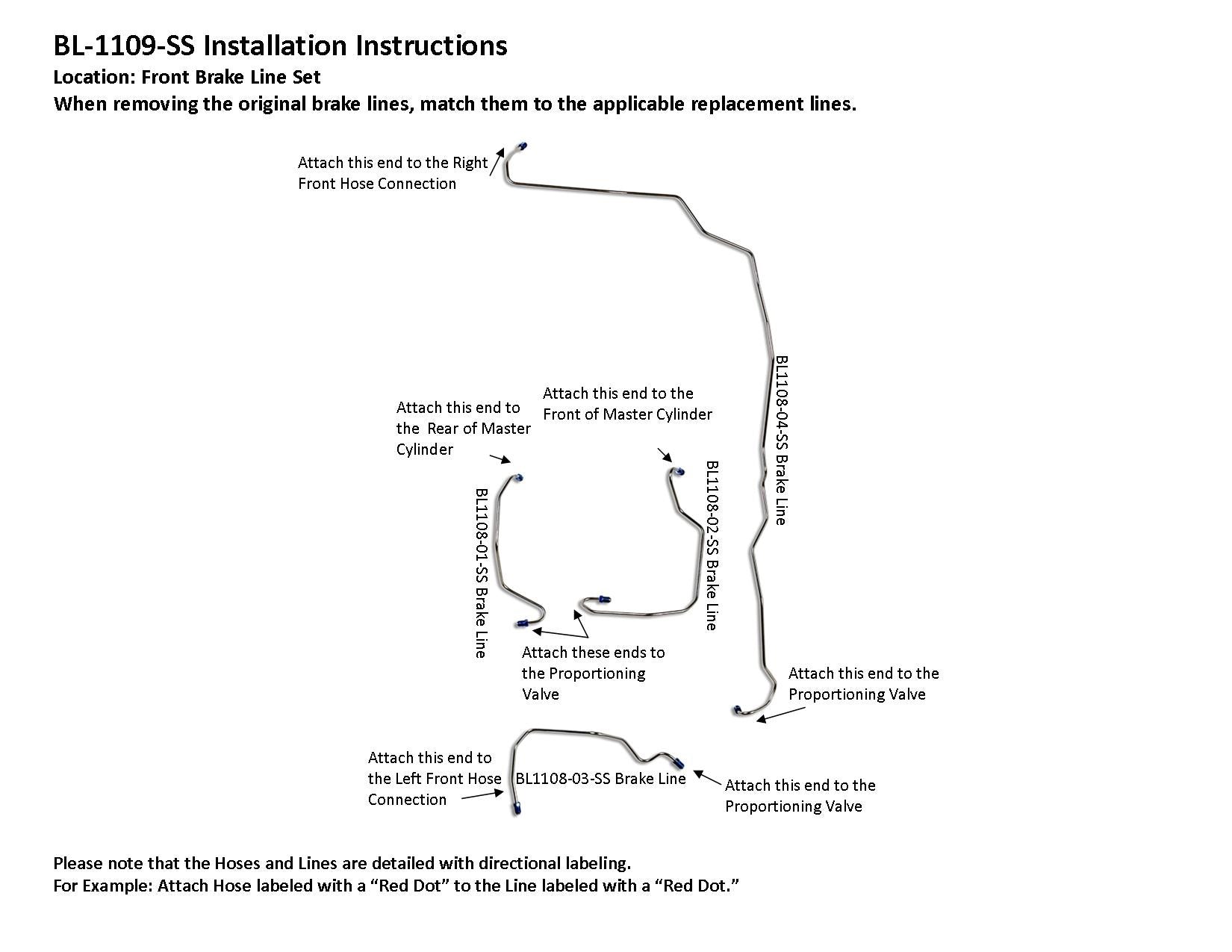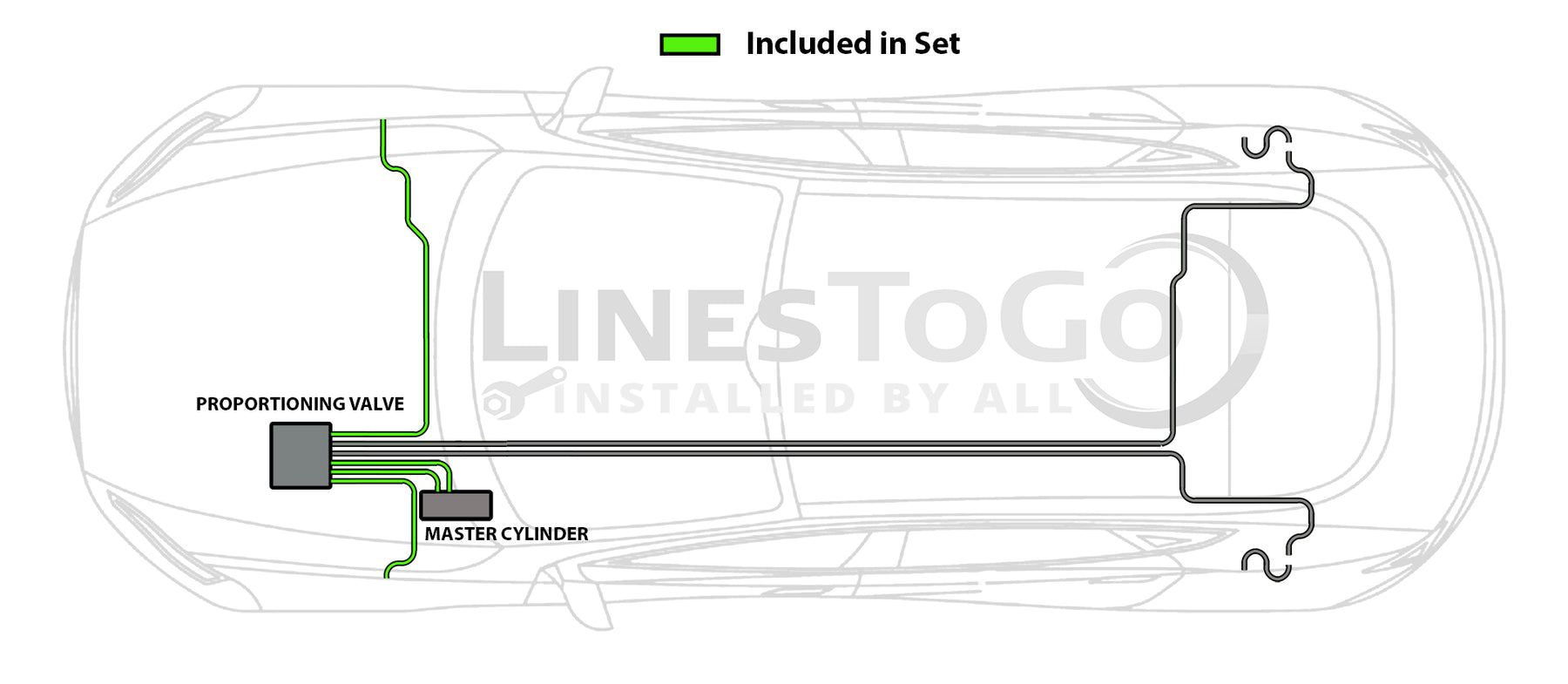 1 conduite de maître-cylindre primaire 3/16", 1 conduite de maître-cylindre secondaire 3/16", 1 conduite de frein avant gauche 3/16", 1 conduite de frein avant droite 3/16", N'inclut PAS les flexibles de frein ni les conduites de frein arrière