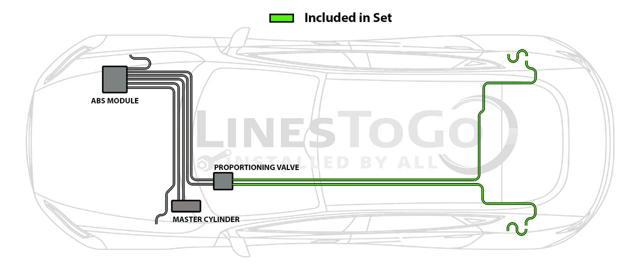 1 conduite de frein arrière gauche 3/16", 1 conduite de cylindre de roue arrière gauche 3/16" (en 3 sections faciles à installer), 1 conduite de frein arrière droite 3/16", 1 conduite de cylindre de roue arrière droite 3/16" (en 4 sections faciles à installer), N'inclut PAS les flexibles de frein