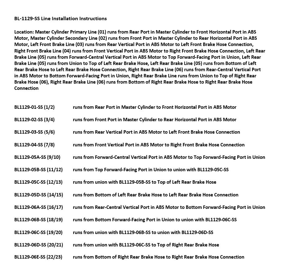 Veuillez noter:Avant d'installer votre conduite de frein, les coudes d'expédition devront être retirés des conduites étiquetées BL1129-01-SS, BL1129-02-SS, BL1129-03-SS, BL1129-05A-SS, BL1129-05B-SS, BL1129-06A-SS et BL1129-06B-SS. Regardez la vidéo ci-dessous pour savoir comment retirer le coude d'expédition