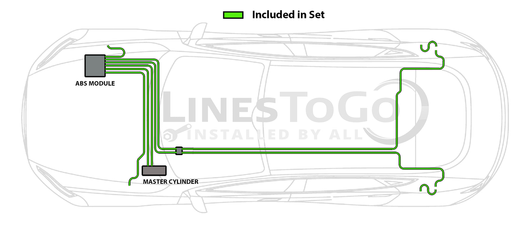 1 conduite de frein primaire de maître-cylindre 3/16", 1 conduite de frein secondaire de maître-cylindre 3/16", 1 conduite de frein avant gauche 3/16", 1 conduite de frein avant droite 3/16", 3 conduites de frein arrière gauche 3/16 " (en 4 sections faciles à installer), 3 conduites de frein arrière droite 3/16" (en 5 sections faciles à installer), N'inclut PAS les flexibles de frein