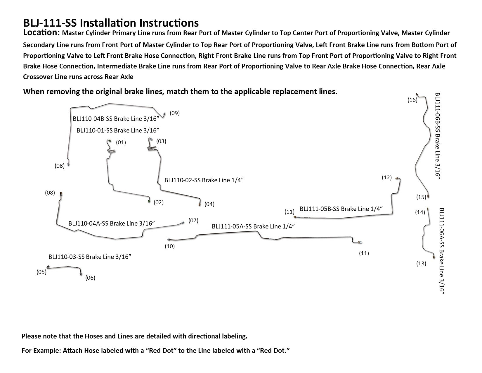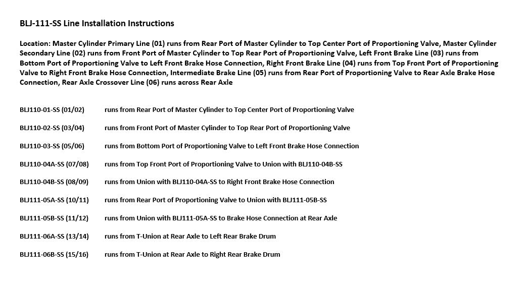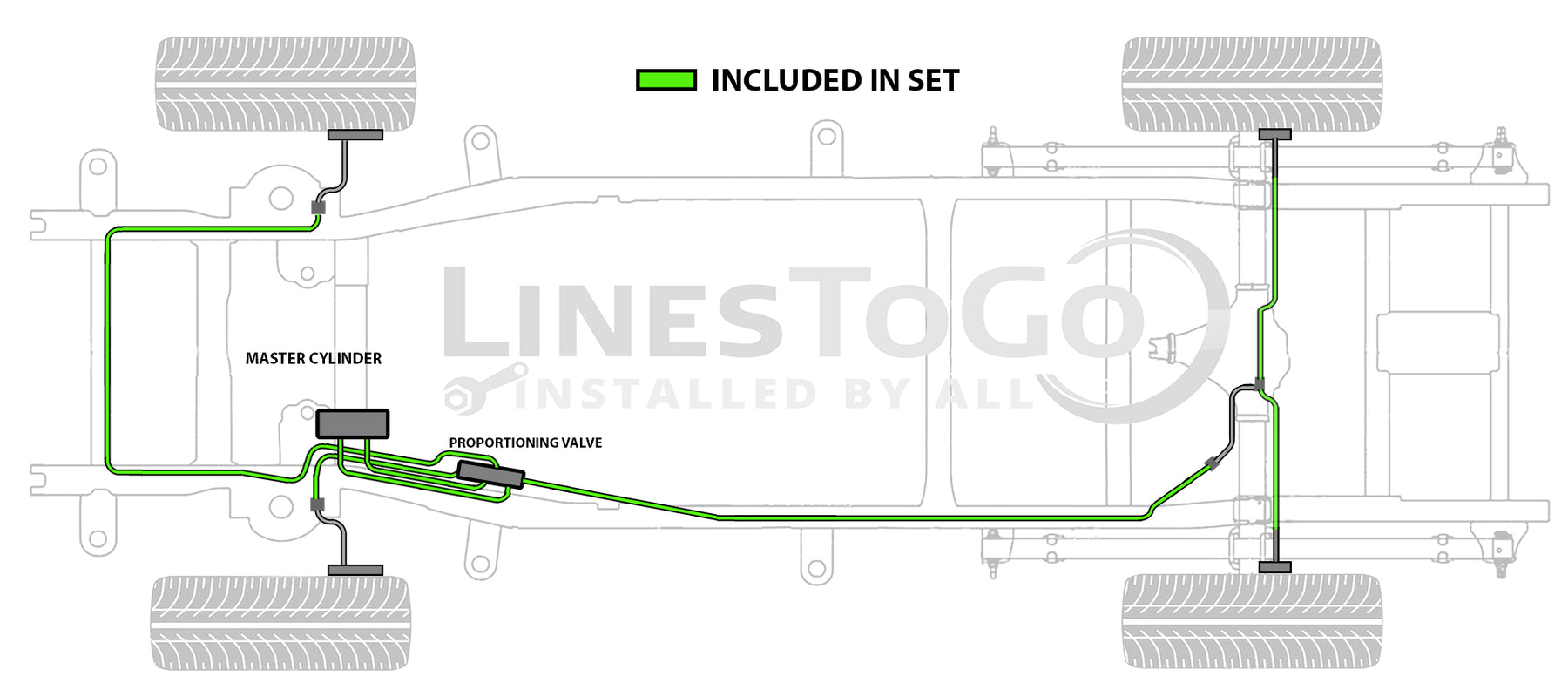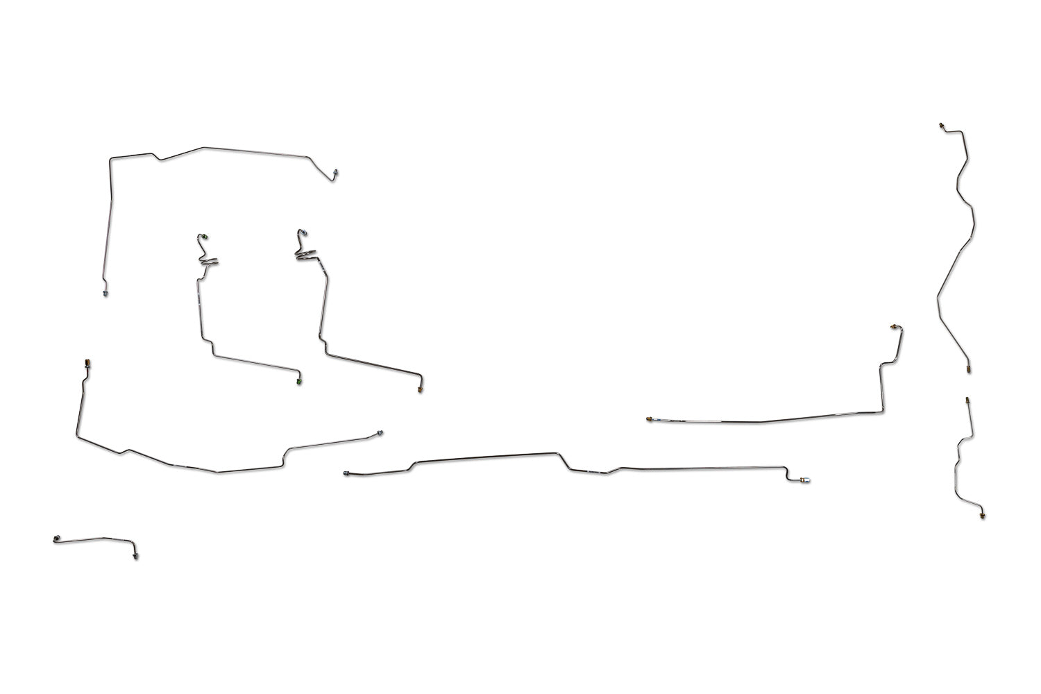1 Master Cylinder Primary Brake Line 3/16", 1 Master Cylinder Secondary Brake Line 1/4", 1 Left Front Brake Line 3/16", 1 Right Front Brake Line 3/16" (in 2 easy to install sections), 1 Intermediate Brake Line 1/4" (in 2 easy to install sections), 1 Rear Axle Crossover Line 3/16" (2 sections), Does NOT include Brake Hoses