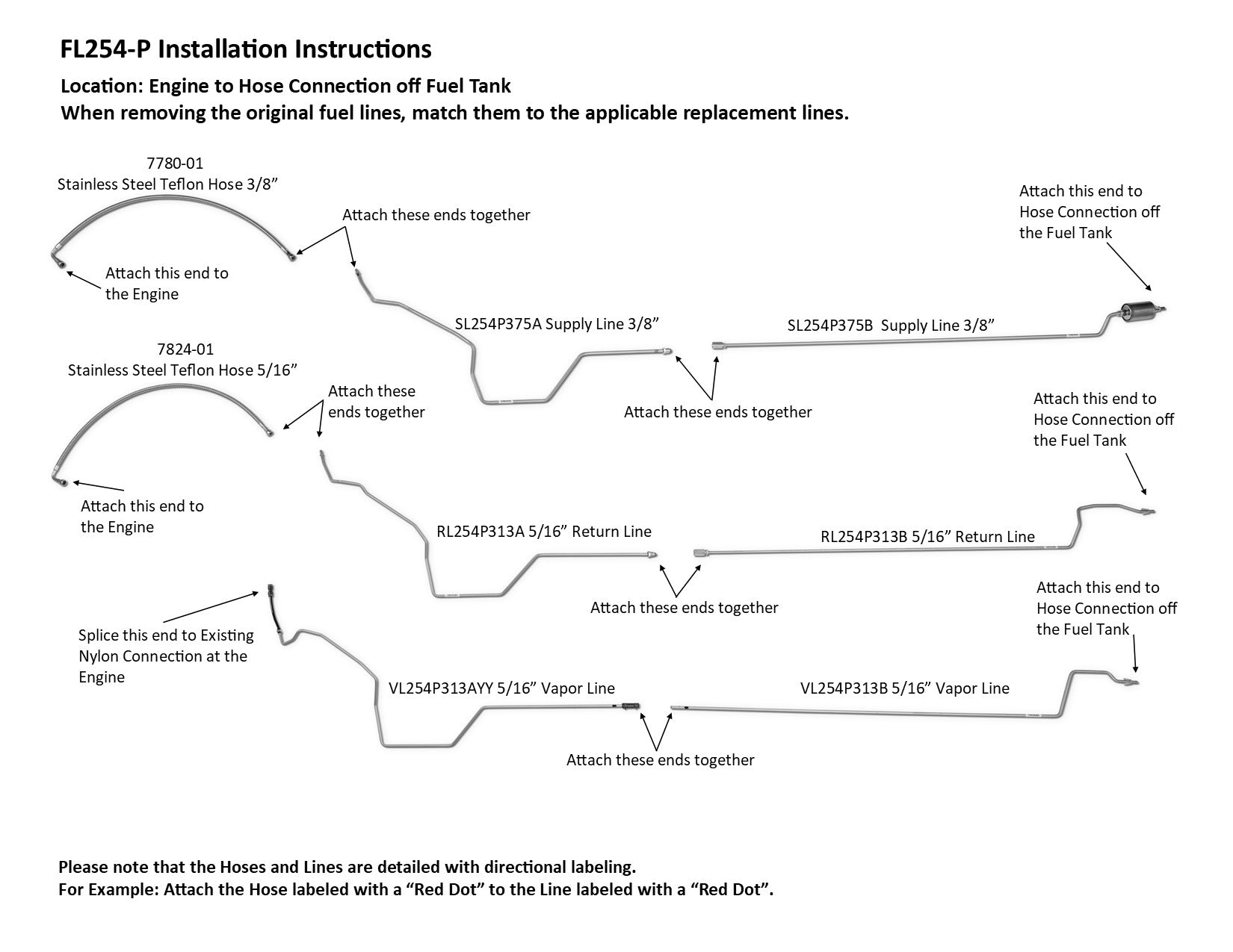 1 conduite d'alimentation 3/8" (en 2 sections faciles à installer), 1 conduite de retour 5/16" (en 2 sections faciles à installer), 1 conduite de vapeur 5/16" (en 2 sections faciles à installer), tuyaux de raccordement au moteur, conduite en nylon avec raccord union, 3 raccords union, 1 filtre à carburant