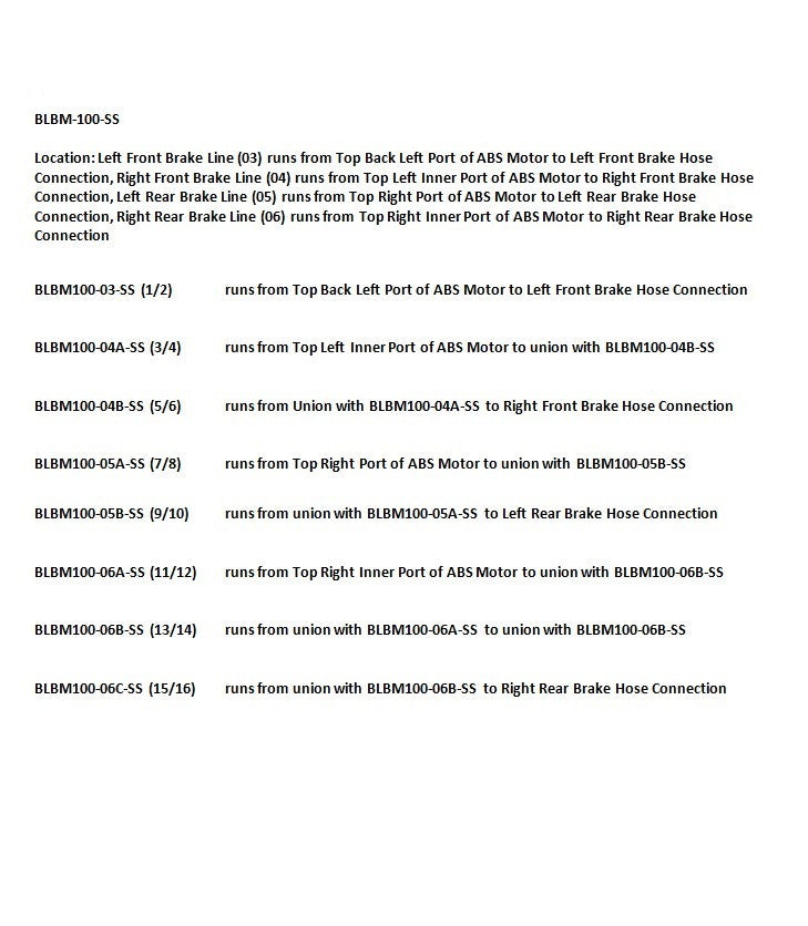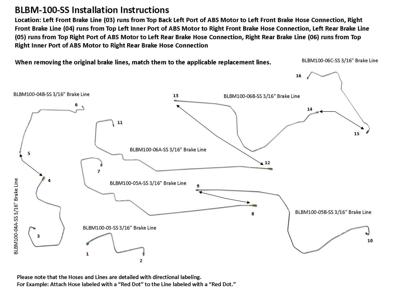 Please Note: Before installing your brake line, shipping bends will need to be removed from the lines labeled BLBM100-05A-SS, BLBM100-05B-SS, BLBM100-06A-SS, BLBM100-06B-SS. See the video below on how to remove the shipping bend