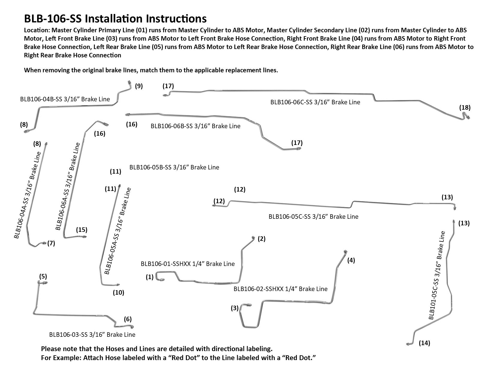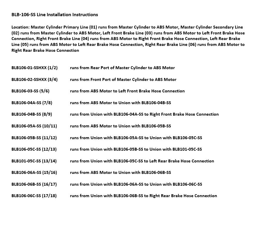 Please Note: Before installing your brake line, shipping bends will need to be removed from the lines labeled BLB106-05C-SS and BLB106-06C-SS. See the video below on how to remove the shipping bend