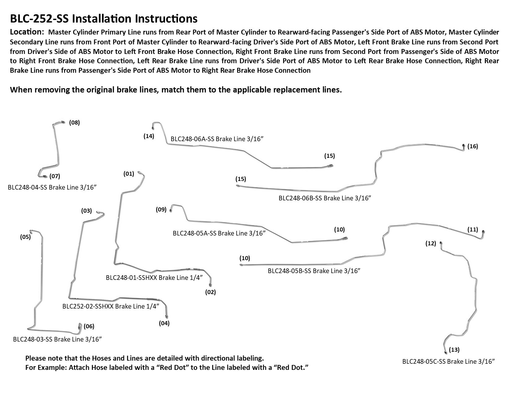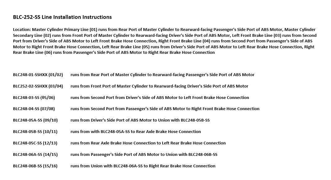 Please Note: Before installing your brake line, a shipping bend will need to be removed from the lines labeled BLC248-05A-SS, BLC248-05B-SS, BLC248-06A-SS, BLC248-06B-SS, BLC248-01-SSHXX and BLC252-02-SSHXX. See the video below on how to remove the shipping bend