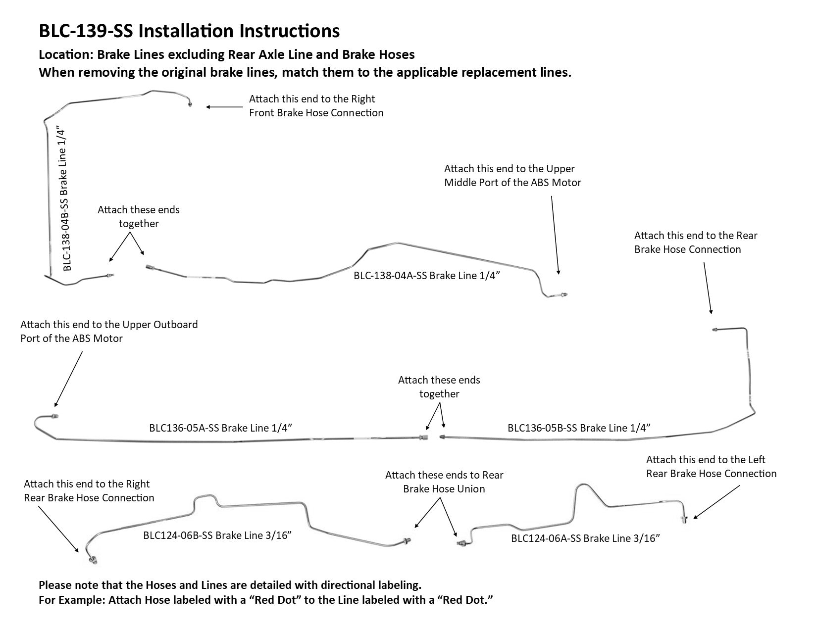 1 Master Cylinder Primary Line from Rear of Master Cylinder to Lower Inboard Port of ABS Module, 1 Master Cylinder Secondary Line from Front of Master Cylinder to Lower Outboard Port of ABS Module, Left Front Line from Hose Connection to Upper Inboard Port of ABS, Right Front Line from Hose Connection to Upper Middle Port of ABS (2 easy to install sections), Rear Line from Hose Connection to Upper Outboard Port of ABS Module (2 easy to install sections), Rear Axle Crossover Line runs across Rear Axle (2 Sections)