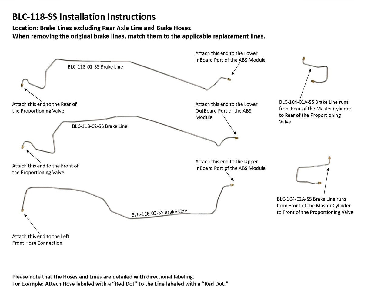 1 Master Cylinder Primary Line from Rear of Proportioning Vale to Lower InBoard Port of ABS Module, 1 Master Cylinder Primary Line from Rear of the Master Cylinder to Rear of the Portioning Valve, 1 Master Secondary Line from Front of Proportioning Valve to Lower Outboard of ABS Module, 1 Master Cylinder Secondary Line from Front of Master Cylinder to Front of Proportioning Valve, 1 Left Front Line from Left Front Hose Connection to Upper Outboard Port of ABS Module, 1 Right Front Line from Right Front Hose Connection to Second Upper Port in from Center of ABS Module (2 easy to install sections), 1 left Rear Line from Rear Hose Connection to Third Upper Port in from Center of ABS Module (2 easy to install sections), 1 Right Rear Line from Rear Hose Connection to Fourth Upper Port from Center of ABS Module (2 easy to install sections), excludes Rear Axle Crossover Line