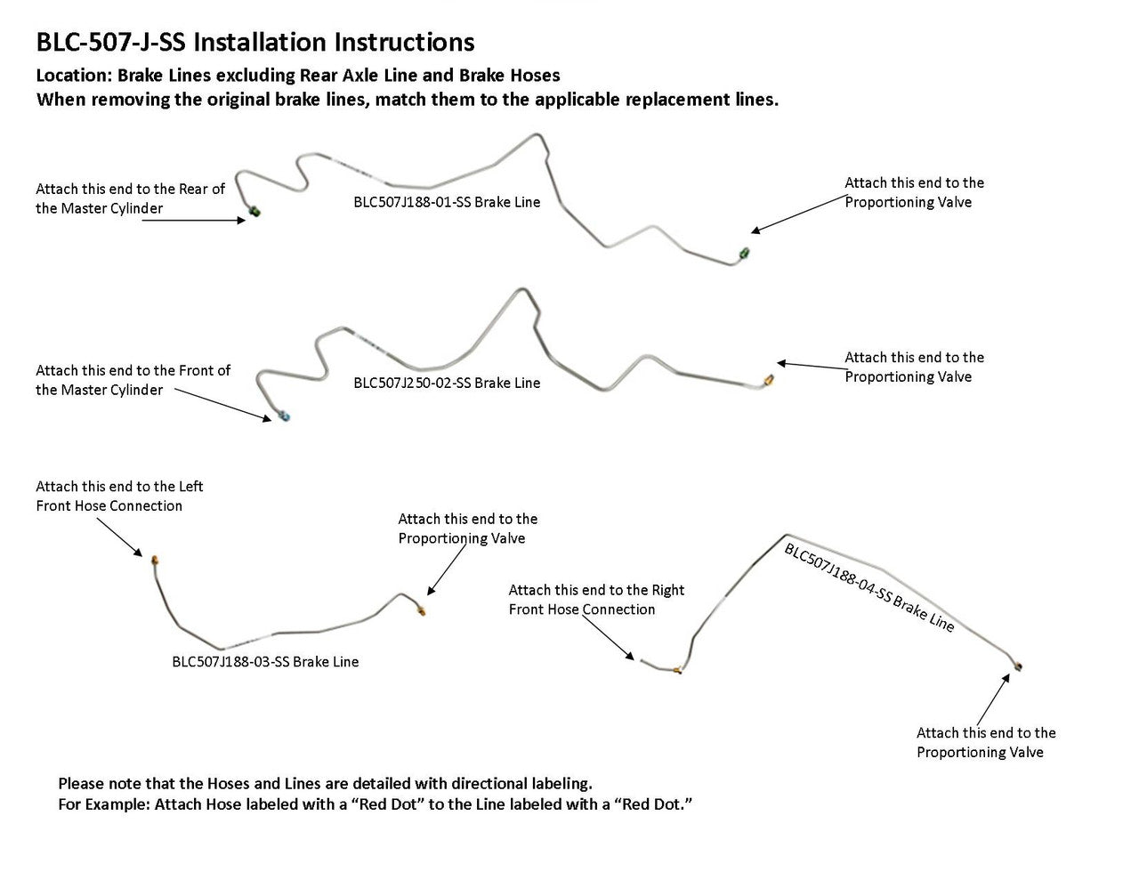 Master Cylinder Primary Line runs from Rear of Master Cylinder to Proportioning Valve, Master Cylinder Secondary Line runs from Front of Master Cylinder to Proportioning Valve, Left Front Brake Line runs from Proportioning Valve to Left Front Hose Connection, Right Front Brake Line runs from Proportioning Valve to Right Front Hose Connection, Rear Brake Line runs from Proportioning Valve to Rear Hose Connection above the Rear Axle