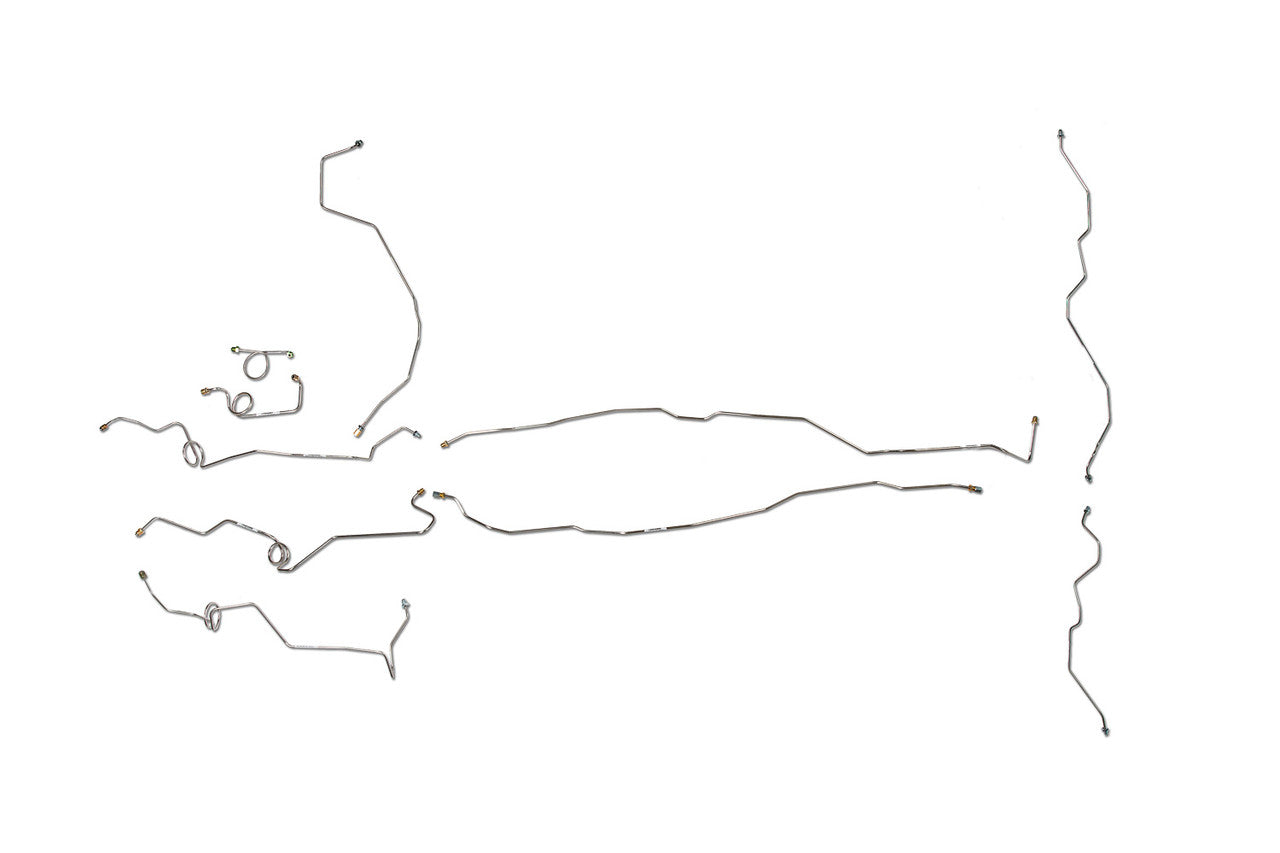 1 Master Cylinder Primary Brake Line 3/16", 1 Master Cylinder Secondary Brake Line 1/4", 1 Left Front Brake Line 3/16", 1 Right Front Brake Line 3/16" (in 2 easy to install sections), 1 Intermediate Brake Line 1/4" (in 2 easy to install sections), 1 Rear Axle Crossover Line 3/16" (2 sections), Does NOT include Hoses