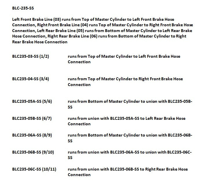 Left Front Brake Line runs from Top of Master Cylinder to Left Front Brake Hose Connection, Right Front Brake Line runs Top of Master Cylinder to Right Front Brake Hose Connection, Left Rear Brake Line runs from Bottom of Master Cylinder to Left Rear Brake Hose Connection, Right Rear Brake Line runs from Bottom of Master Cylinder to Right Rear Brake Hose Connection