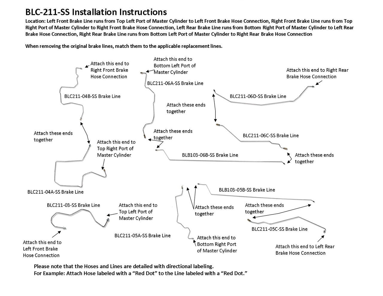 Left Front Brake Line runs from Top Left Port of Master Cylinder to Left Front Brake Hose Connection, Right Front Brake Line runs from Top Right Port of Master Cylinder to Right Front Brake Hose Connection, Left Rear Brake Line runs from Bottom Right Port of Master Cylinder to Left Rear Brake Hose Connection, Right Rear Brake Line runs from Bottom Left Port of Master Cylinder to Right Rear Brake Hose Connection