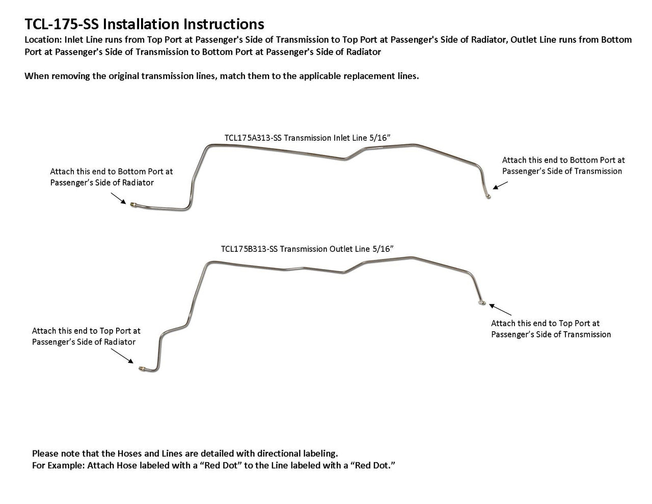 Inlet Line runs from Top Port at Passenger's Side of Transmission to Top Port at Passenger's Side of Radiator, Outlet Line runs from Bottom Port at Passenger's Side of Transmission to Bottom Port at Passenger's Side of Radiator