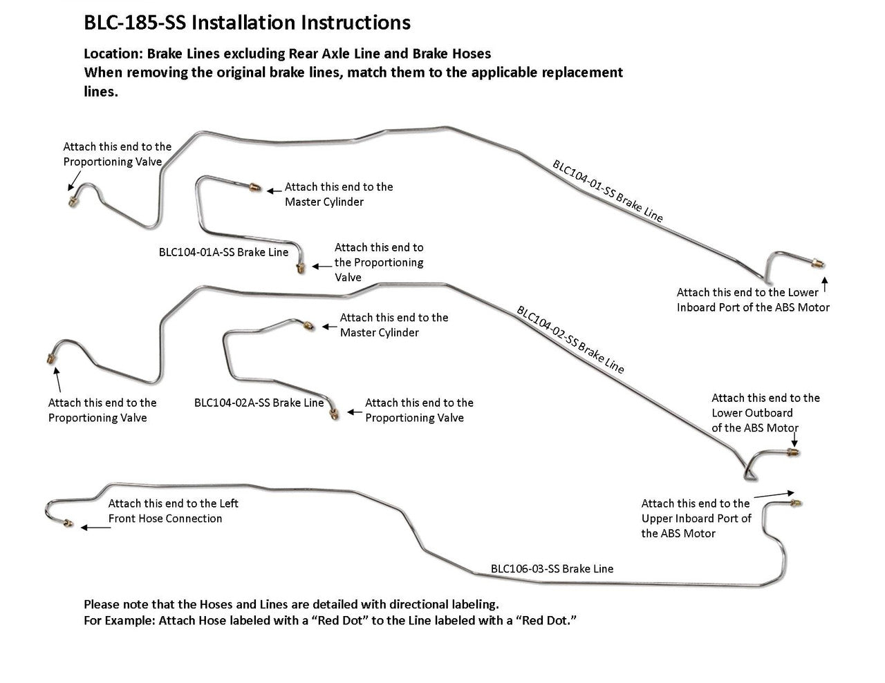 1 Master Cylinder Primary Line from Rear of Master Cylinder to Lower Inboard Port of ABS Module, 1 Master Cylinder Secondary Line from Front of Master Cylinder to Lower Outboard Port of ABS Module, 1 Left Front Line from Upper Inboard Port of ABS Motor to Left Front Wheel Hose Connection, 1 Right Front Line from Upper Middle Port of ABS Motor to the Right Front Wheel Connection (2 easy to install sections), 1 Rear Line from Rear Hose Connection to Upper Outboard Port of ABS Module (2 easy to install sections), excludes Rear Axle Line
