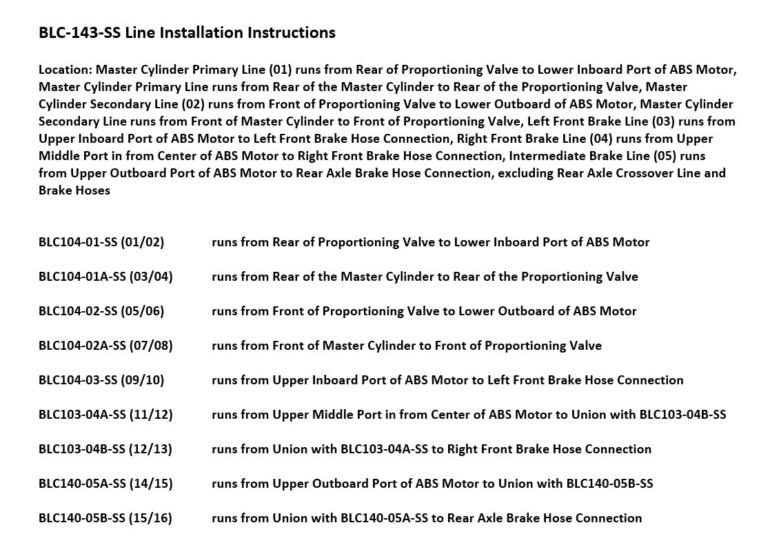 1 Master Cylinder Primary Line from Rear of Proportioning Valve to Lower InBoard Port of ABS Module, 1 Master Cylinder Primary Line from Rear of the Master Cylinder to Rear of the Portioning Valve, 1 Master Secondary Line from Front of Proportioning Valve to Lower Outboard of ABS Module, 1 Master Cylinder Secondary Line from Front of Master Cylinder to Front of Proportioning Valve, 1 Left Front Line from Front Hose Connection to Upper Inboard Port of ABS Module, 1 Right Front Line from Front Hose Connection to Upper Middle Port in from Center of ABS Module (2 easy to install sections), 1 Rear Line from Rear Hose Connection to Upper Outboard Port of ABS Module (2 easy to install sections) excludes Rear Axle Crossover Line