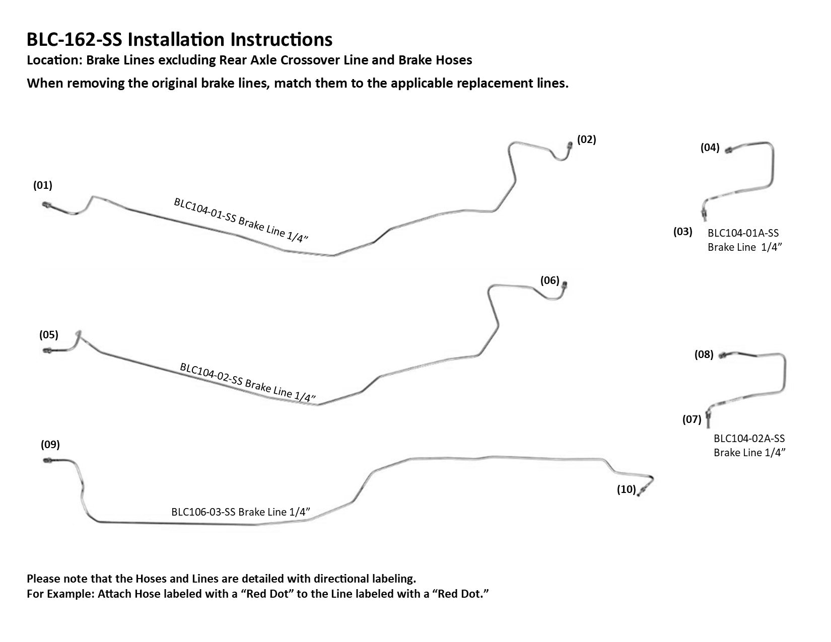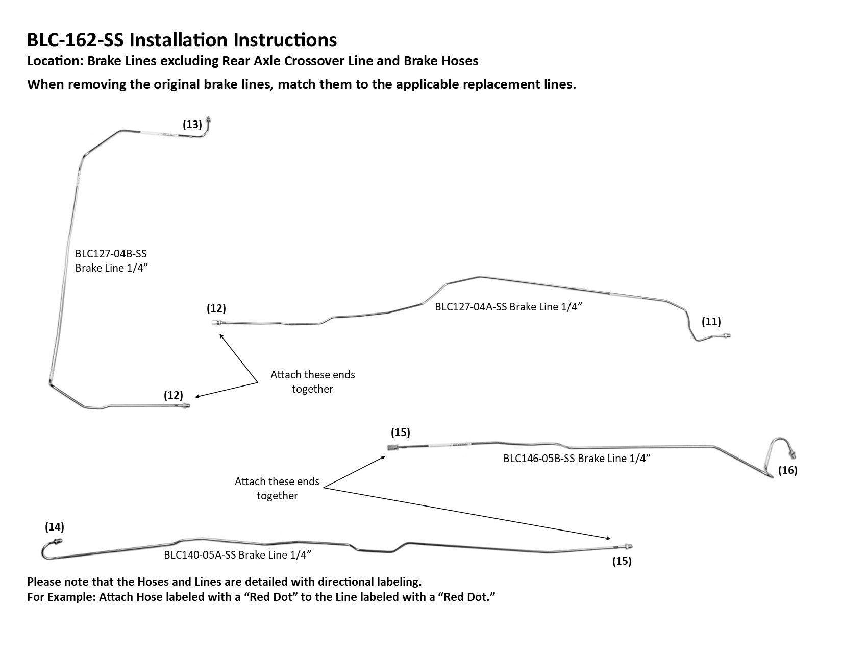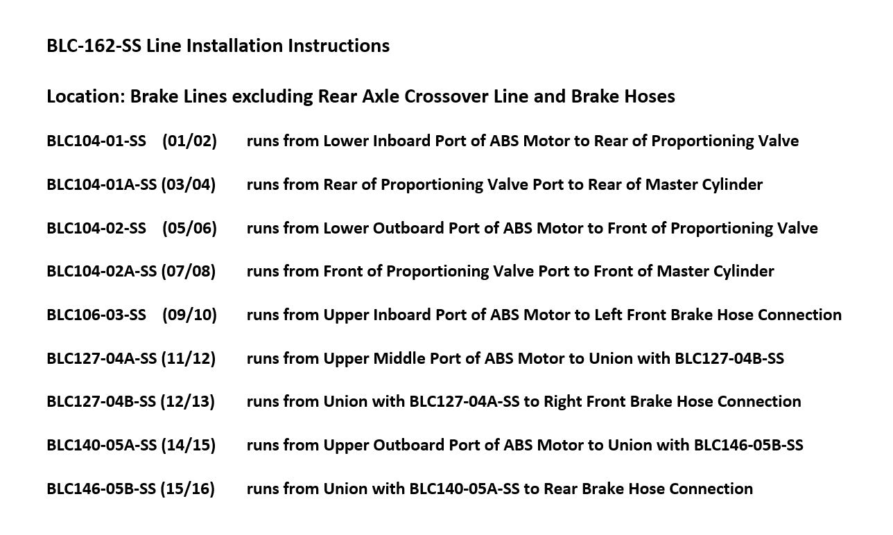 Please Note: Before installing your brake line, a shipping bend will need to be removed from the lines labeled BLC104-01-SS, BLC104-02-SS, BLC106-03-SS, BLC127-04A-SS, BLC127-04B-SS, and BLC140-05A-SS. See the video below on how to remove the shipping bend