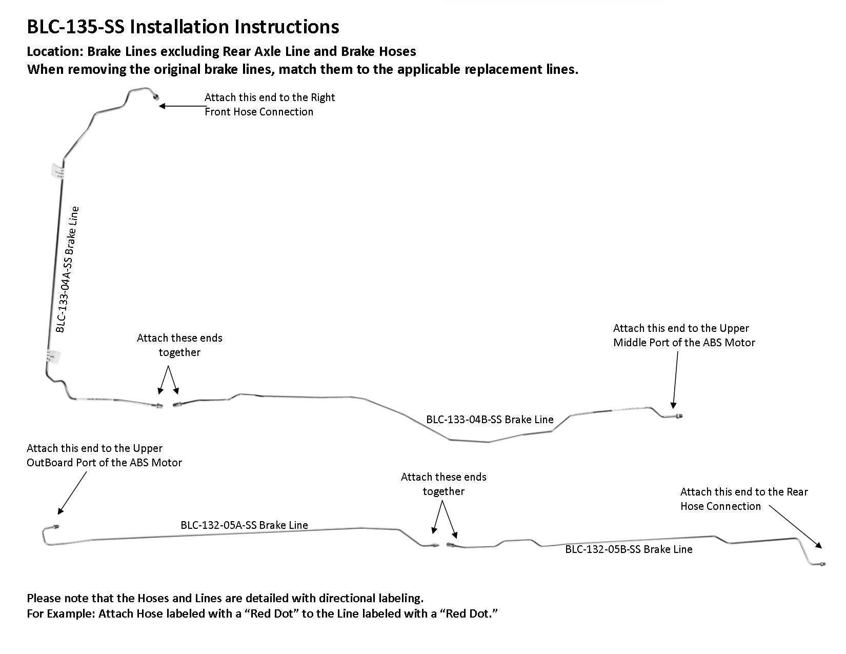 1 Master Cylinder Primary Line from Rear of Master Cylinder to Lower Inboard Port of ABS Motor, 1 Master Cylinder Secondary Line from Front of Master Cylinder to Lower Outboard Port of ABS Motor, 1 Left Front Line from Left Front Hose Connection to Upper Inboard Port of ABS Motor, 1 Right Front Line from Right Front Hose Connection to Upper Middle Port of ABS Motor (2 easy to install sections), 1 Rear Line from Rear Hose Connection to Upper Outboard Port of ABS Motor (2 easy to install sections)