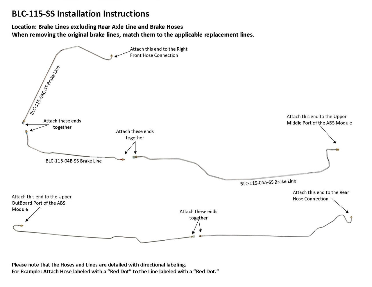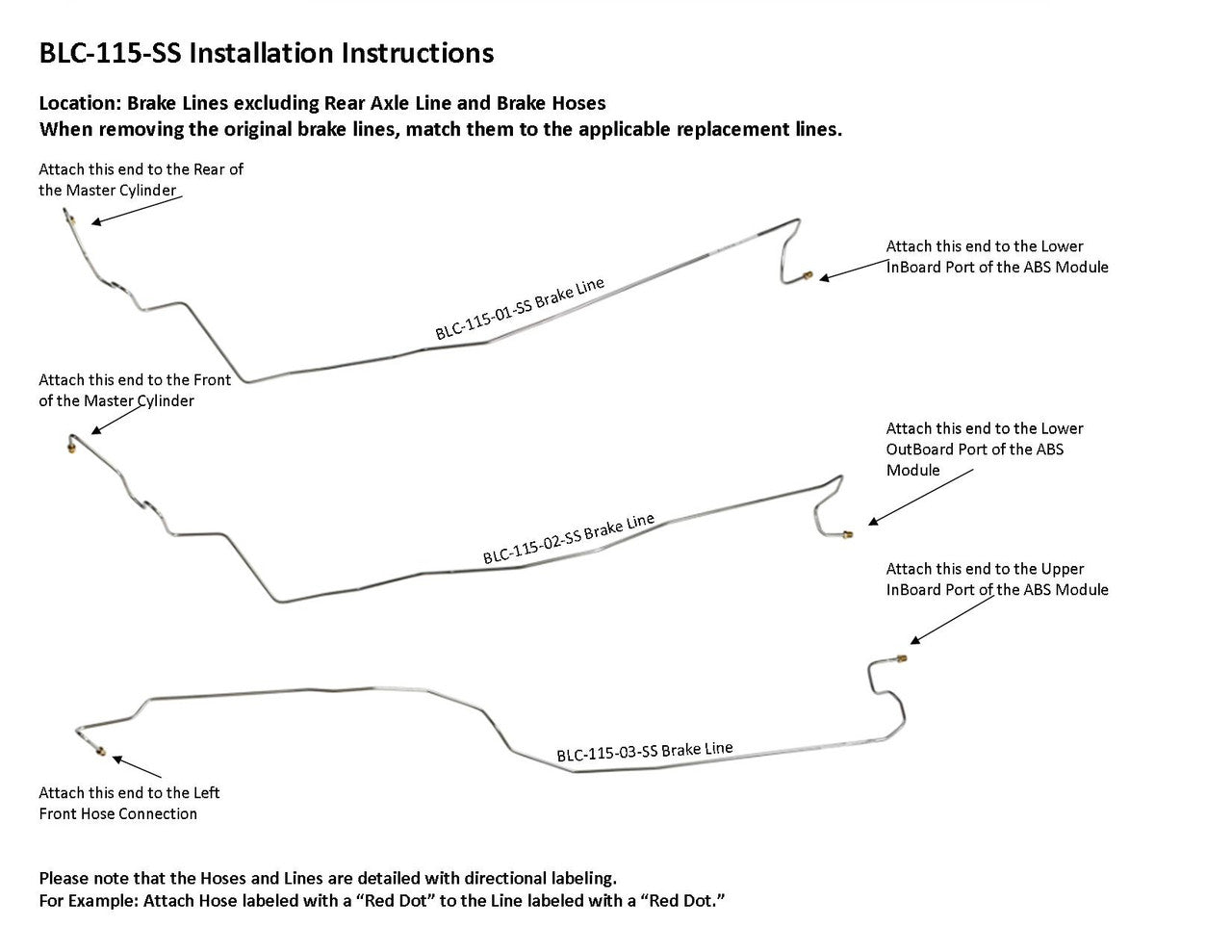 1 Master Cylinder Primary Line from Rear of Master Cylinder to Lower Inboard Port of ABS Module, 1 Master Cylinder Secondary Line from Front of Master Cylinder to Lower Outboard Port of ABS Module, Left Front Line from Hose Connection to Upper Inboard Port of ABS, Right Front Line from Hose Connection to Upper Middle Port of ABS (3 easy to install sections), Rear Line from Hose Connection to Upper Outboard Port of ABS Module (2 easy to install sections)