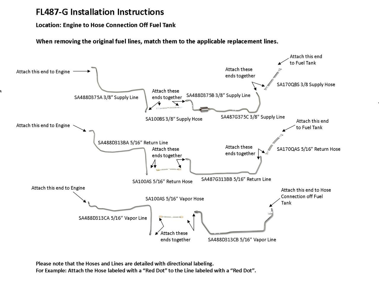 1 supply line 3/8" (in 2 easy to install sections), 1 return line 5/16" (in 2 easy to install sections), 1 vapor line 5/16" (in 2 easy to install sections), hoses to join rear and front sections, hoses to engine connection, 1 fuel filter