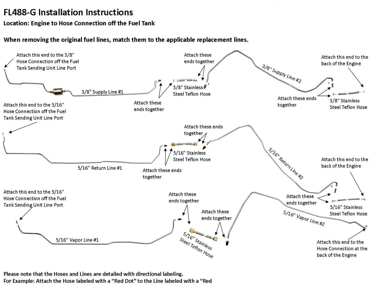 1 supply line 3/8" ( in 2 easy to install sections), 1 return line 5/16" ( in 2 easy to install sections), 1 vapor line 5/16" ( in 2 easy to install sections), hoses to join rear and front sections, hoses to engine connection, 1 fuel filter