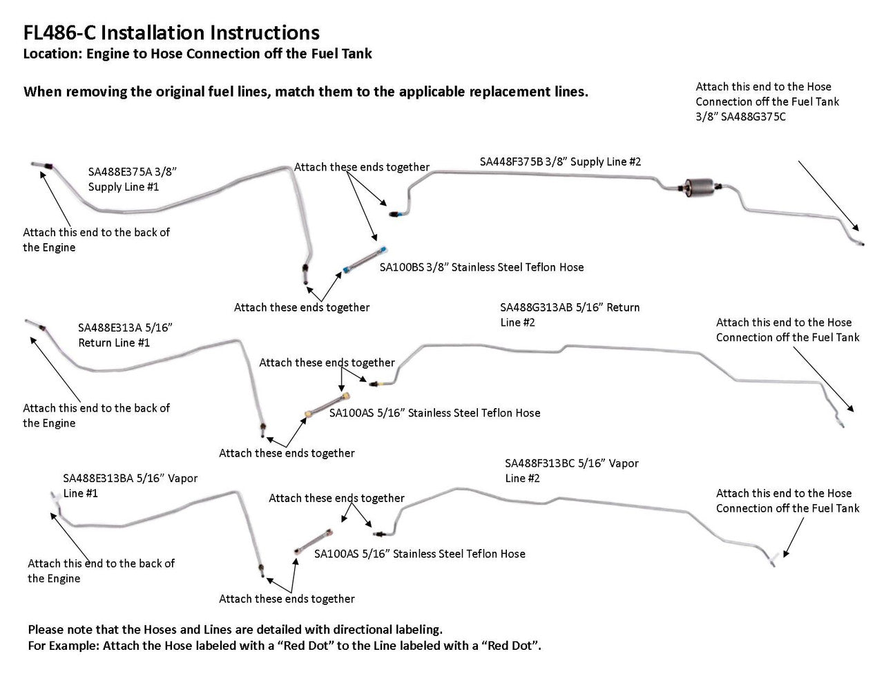 1 supply line 3/8" ( in 2 easy to install sections), 1 return line 5/16" ( in 2 easy to install sections), 1 vapor line 5/16" ( in 2 easy to install sections), hoses to join rear and front sections, 1 fuel filter