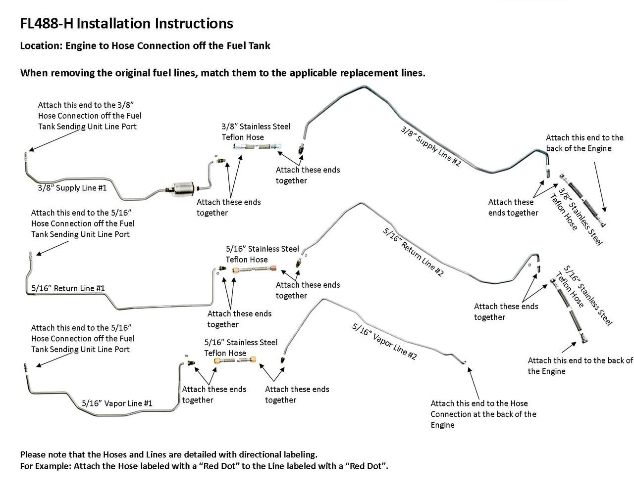 1 supply line 3/8" ( in 2 easy to install sections), 1 return line 5/16" ( in 2 easy to install sections), 1 vapor line 5/16" ( in 2 easy to install sections), hoses to engine connection, hoses to join rear and front sections, 1 fuel filter
