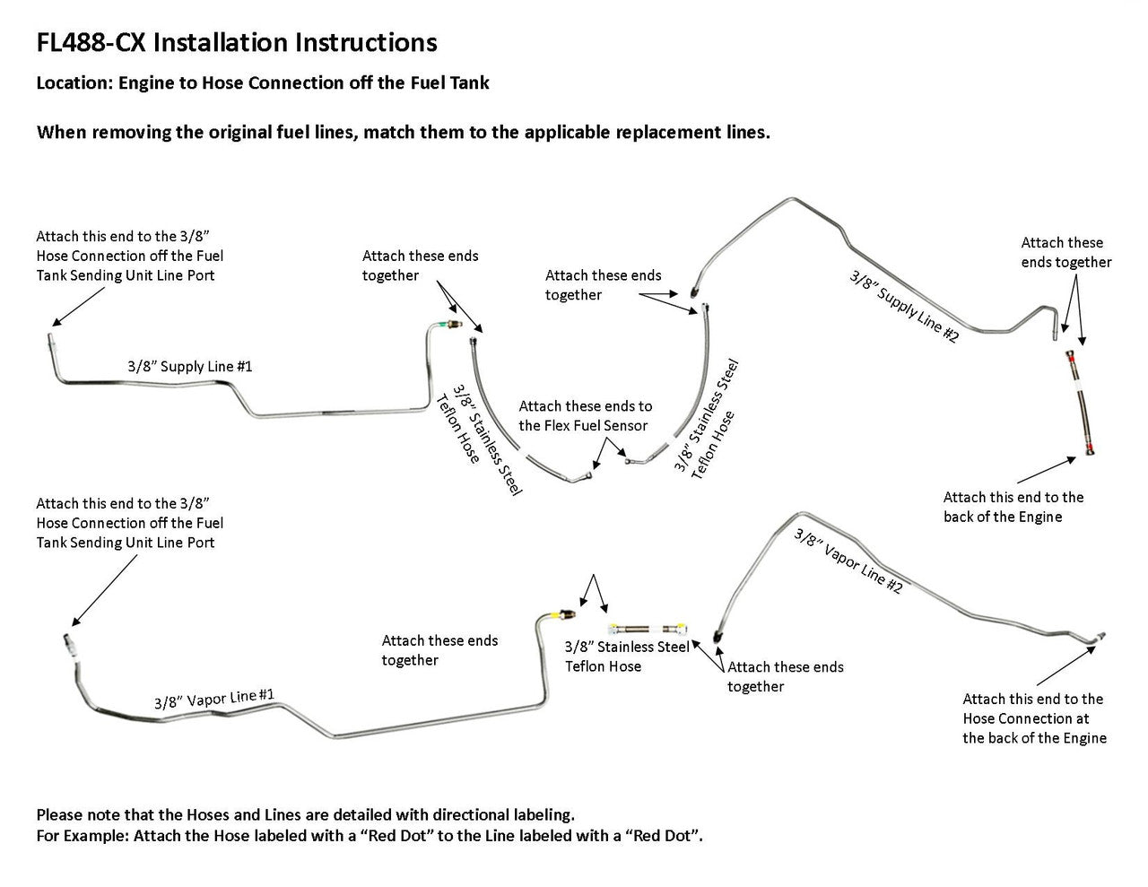 1 supply line 3/8" ( in 2 easy to install sections), 1 vapor line 3/8" ( in 2 easy to install sections), hose to engine connection, hoses to flex fuel sensor, hose to join rear and front section