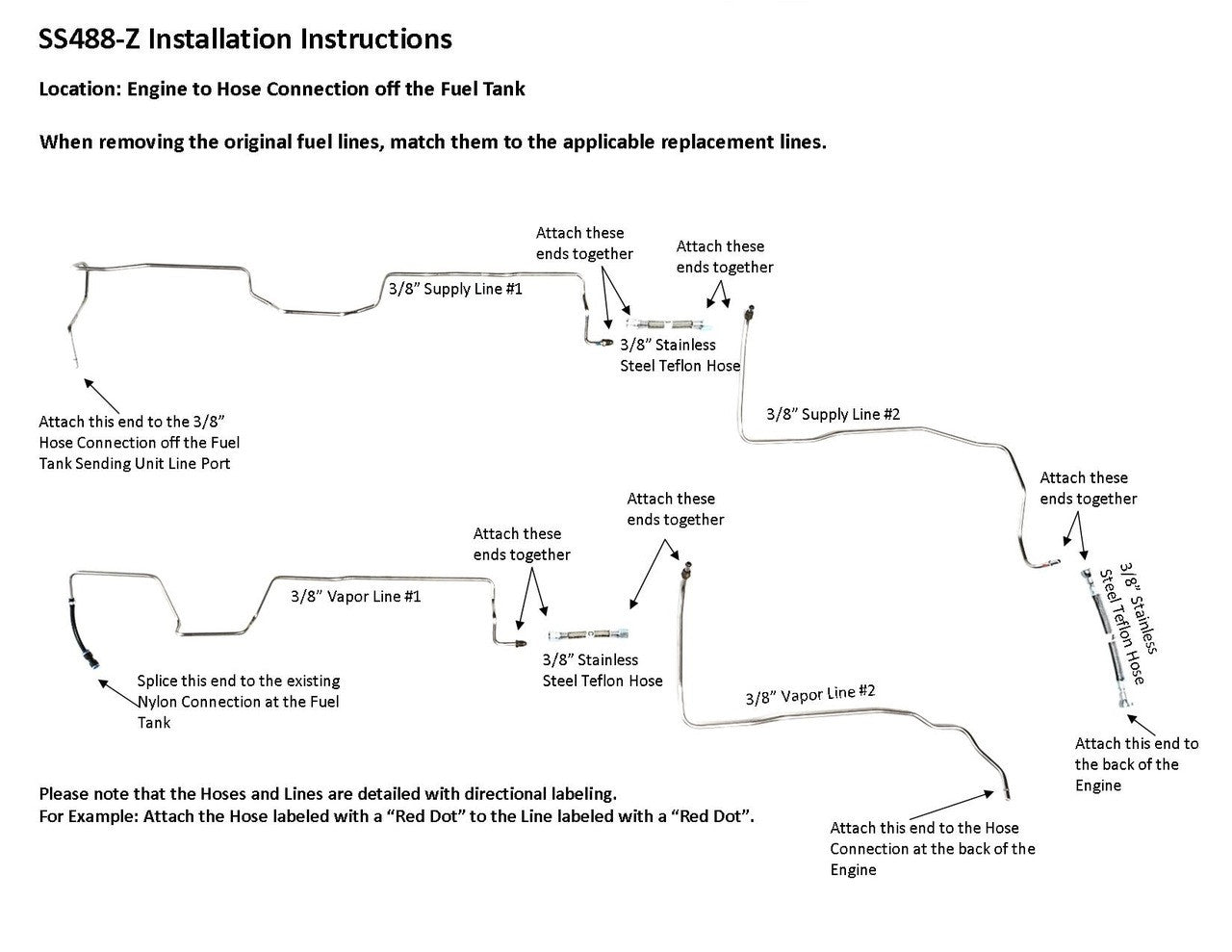 1 supply line 3/8" ( in 2 easy to install sections), 1 vapor line 3/8" ( in 2 easy to install sections), hose to engine connection, hoses to join rear and front section, nylon line with union