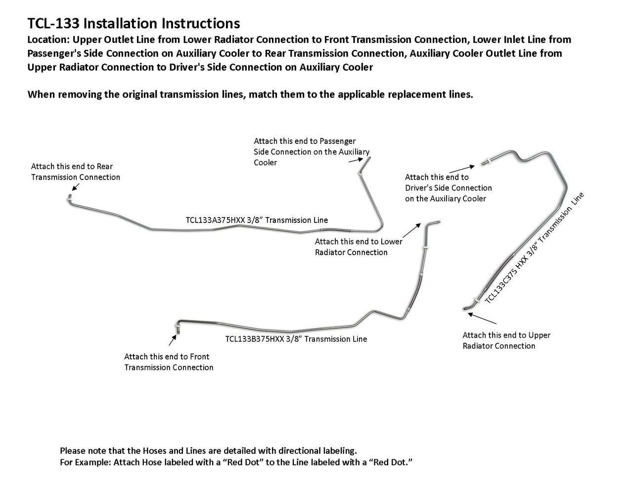 Upper Outlet Line from Lower Radiator Connection to Front Transmission Connection, Lower Inlet Line from Passenger's Side Connection on Auxiliary Cooler to Rear Transmission Connection, Auxiliary Cooler Outlet Line from Upper Radiator Connection to Driver's Side Connection on Auxiliary Cooler