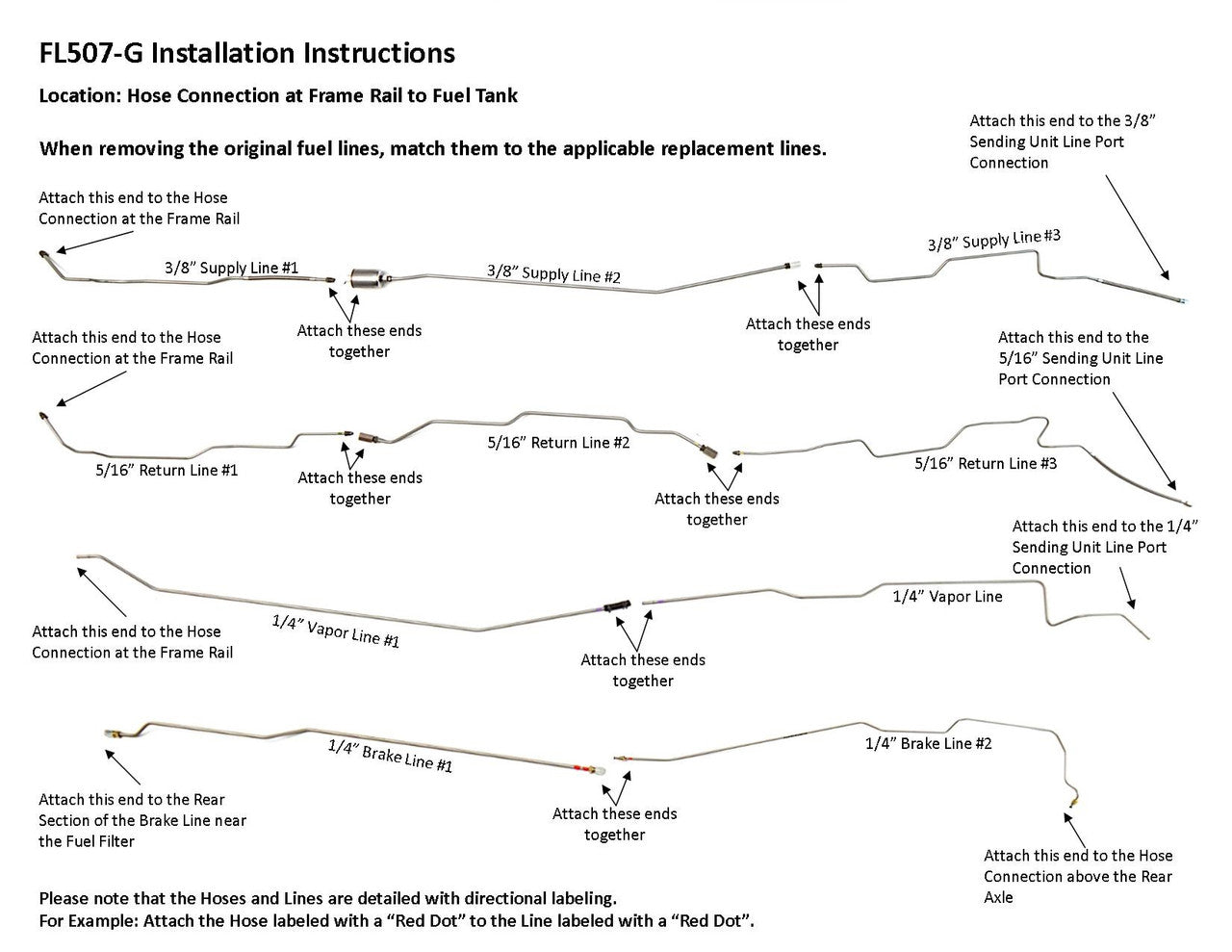 1 supply line 3/8" ( in 3 easy to install sections), 1 return line 5/16" ( in 3 easy to install sections), 1 vapor line 1/4" ( in 2 easy to install sections), 1 brake line 1/4" ( in 2 easy to install sections), hoses to sending unit connection, 1 fuel filter, 5 unions