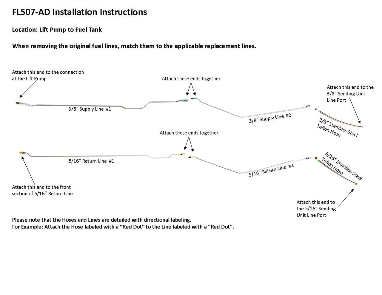 1 supply line 3/8" ( in 2 easy to install sections), 1 return line 5/16" ( in 2 easy to install sections), hoses to sending unit connection, 3 unions