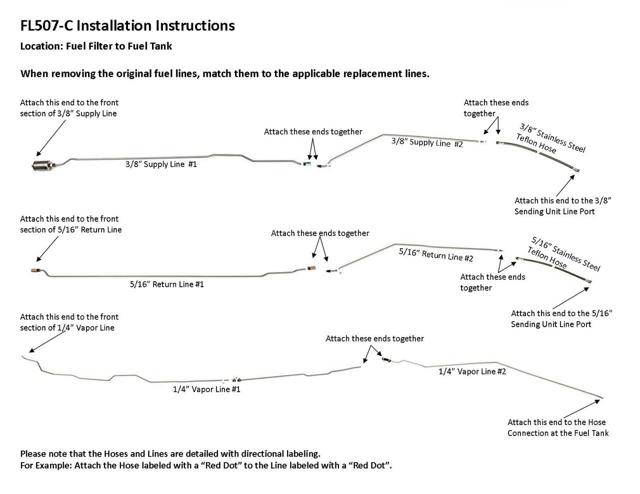 1 supply line 3/8" ( in 2 easy to install sections), 1 return line 5/16" ( in 2 easy to install sections), 1 vapor line 1/4" ( in 2 easy to install sections), hoses to sending unit connection, 1 fuel filter, 3 unions