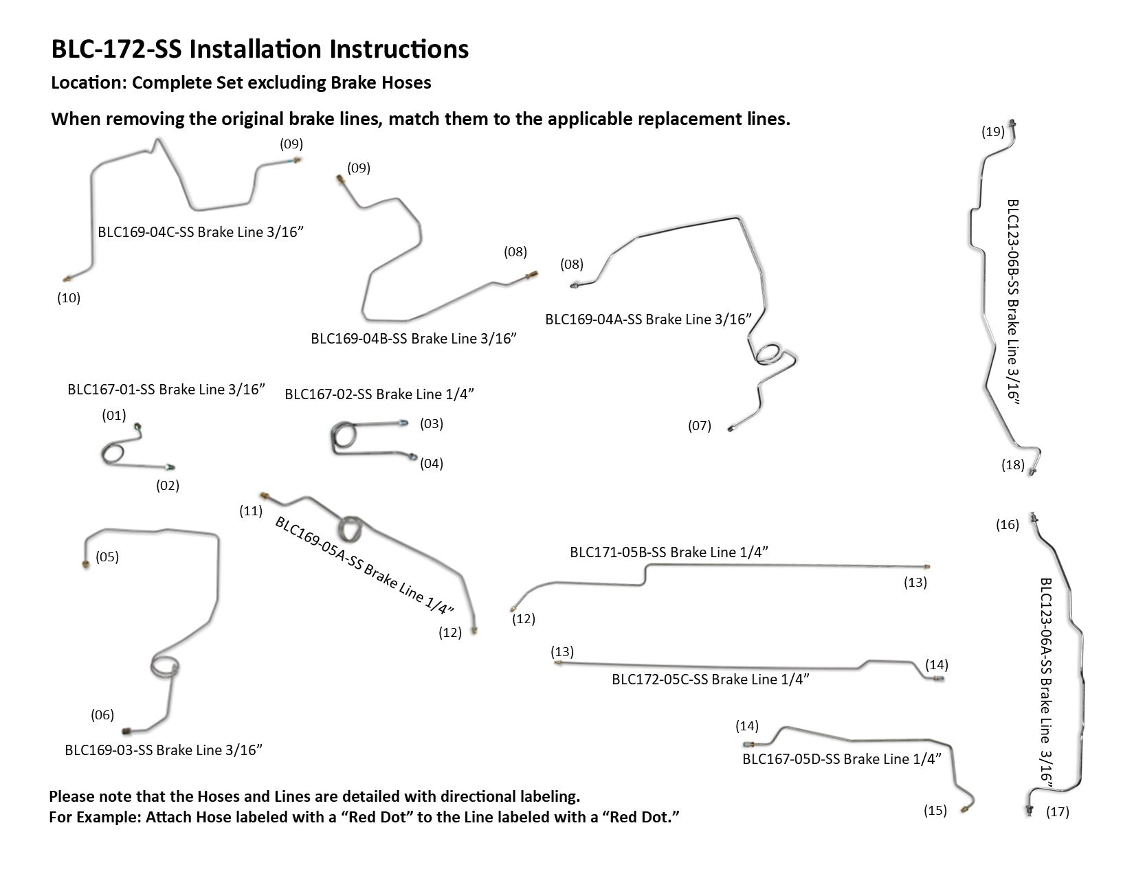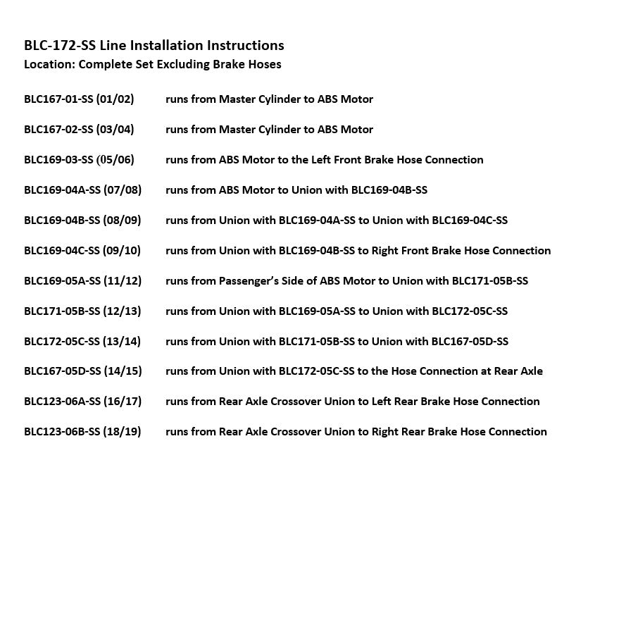 1 Primary Line 3/16" from Master Cylinder to ABS, 1 Secondary Line 1/4" from Master Cylinder to ABS, 1 Left Front Line 3/16" from ABS Motor to Left Front Wheel Hose Connection, 1 Right Front Line 3/16" from ABS Motor to the Right Front Wheel Connection (3 easy to install sections), 1 Intermediate Line 1/4" from ABS Motor to the Rear Axle Hose Connection (4 easy to install sections), 1 Rear Axle Line 3/16" (2 sections)