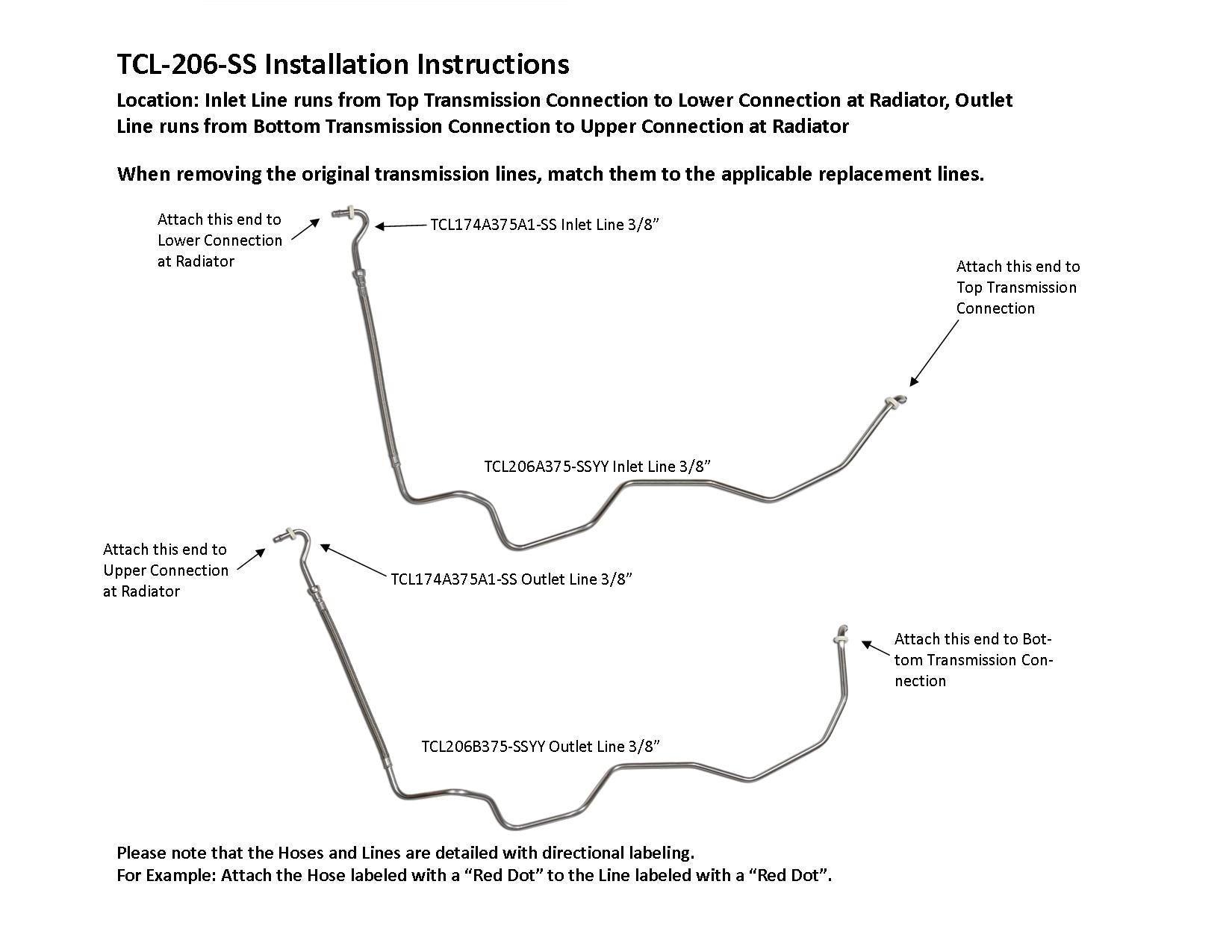 Inlet Line runs from Top Transmission Connection to Lower Connection at Radiator, Outlet Line runs from Bottom Transmission Connection to Upper Connection at Radiator