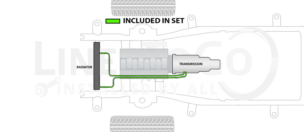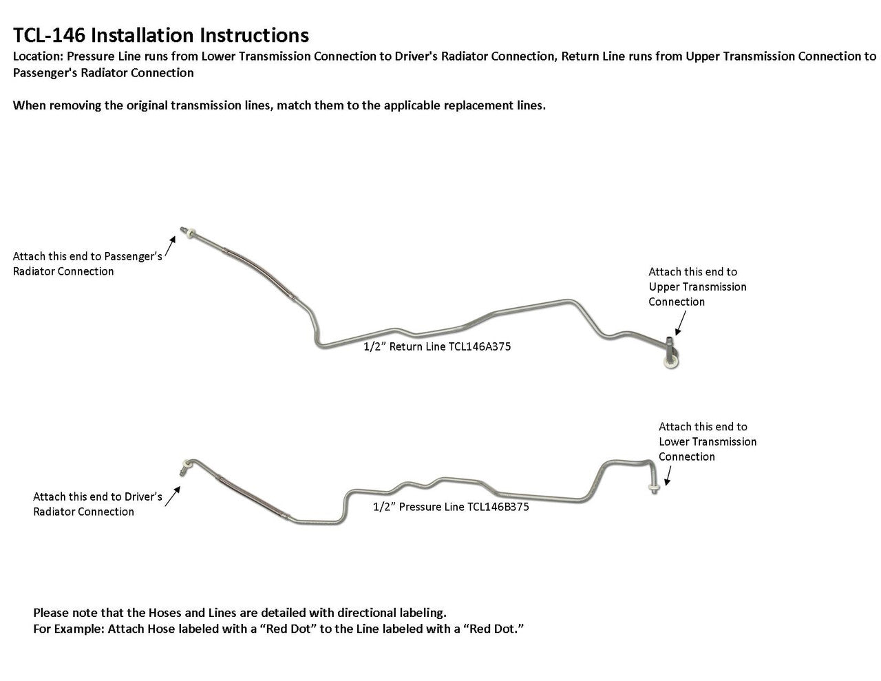 Pressure Line runs from Lower Transmission Connection to Driver's Radiator Connection, Return Line runs from Upper Transmission Connection to Passenger's Radiator Connection