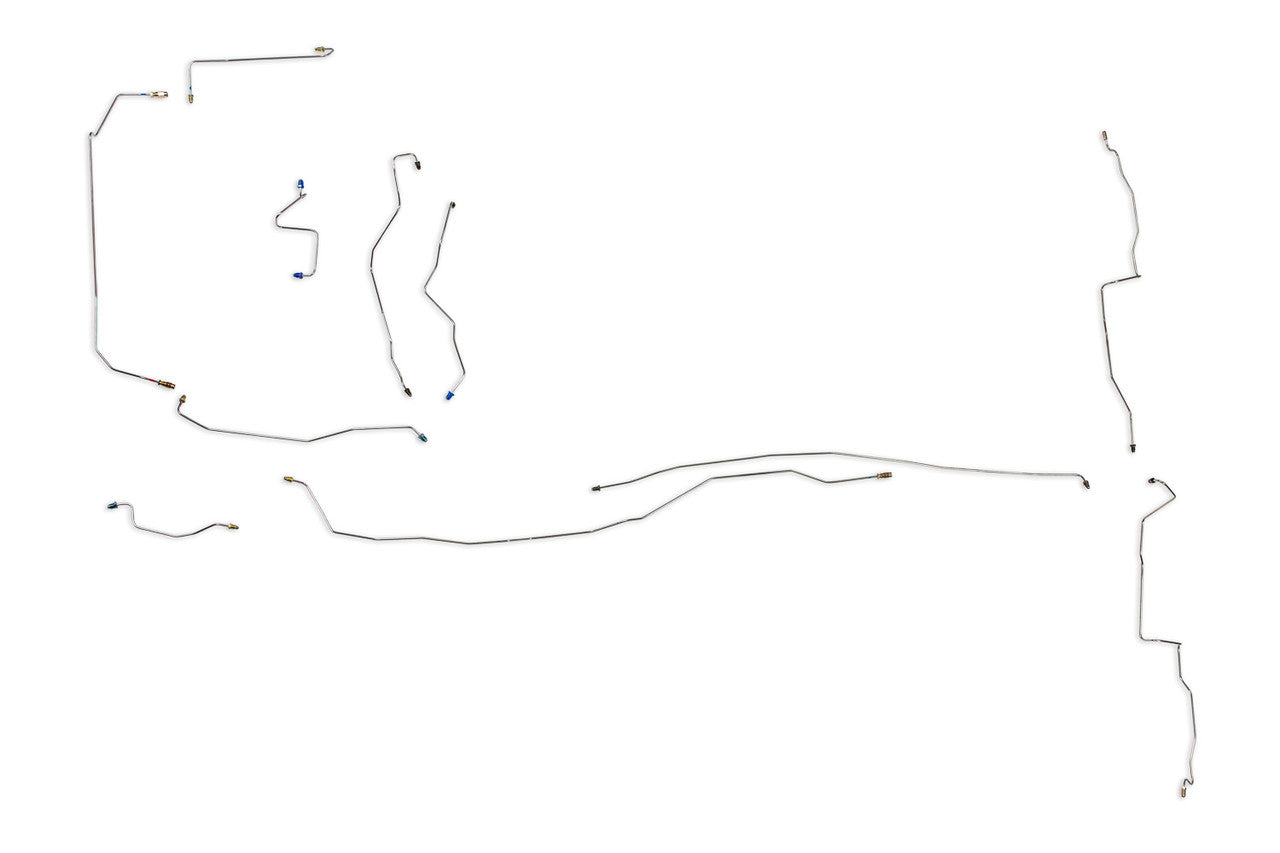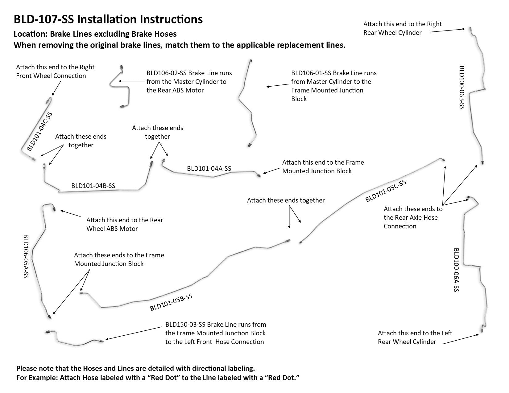 1 Master Cylinder Primary Line from Rear of Master Cylinder to Frame Mounted Junction Block, 1 Master Cylinder Secondary Line from Master Cylinder to Rear Wheel ABS Motor, 1 Left Front Line from Frame Mounted Junction Block to Left Front Wheel, 1 Right Front Line from Frame Mounted Junction Block to the Right Front Wheel (3 easy to install sections), 1 Rear Intermediate Line from Rear Wheel ABS Motor to Frame Mounted Junction Block to Rear Axle Hose Connection (3 easy to install sections), 1 Rear Axle Line across Top of the Rear Axle (2 sections)