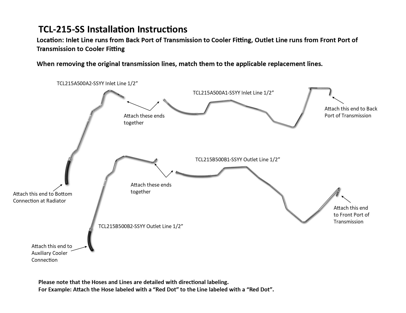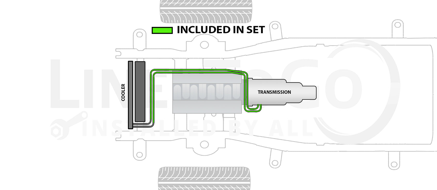 Inlet Line runs from Back Port of Transmission to Cooler Fitting, Outlet Line runs from Front Port of Transmission to Cooler Fitting