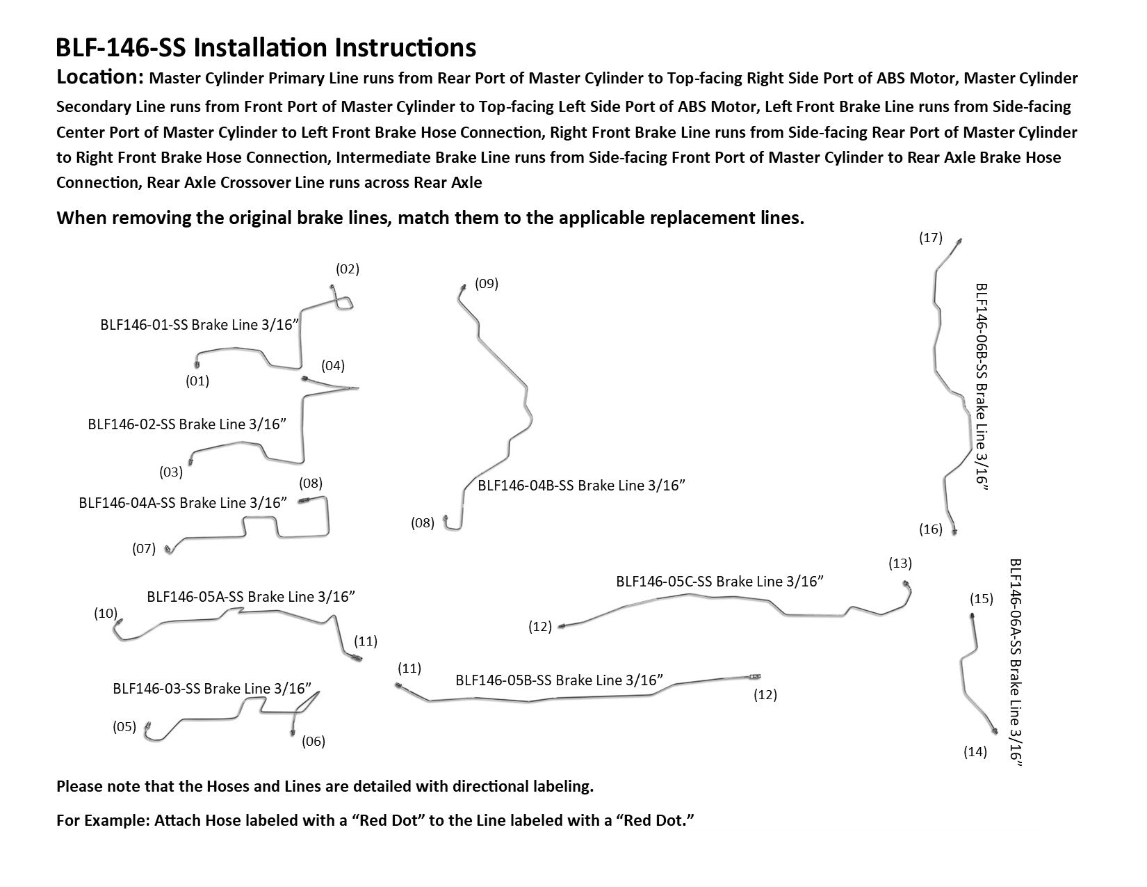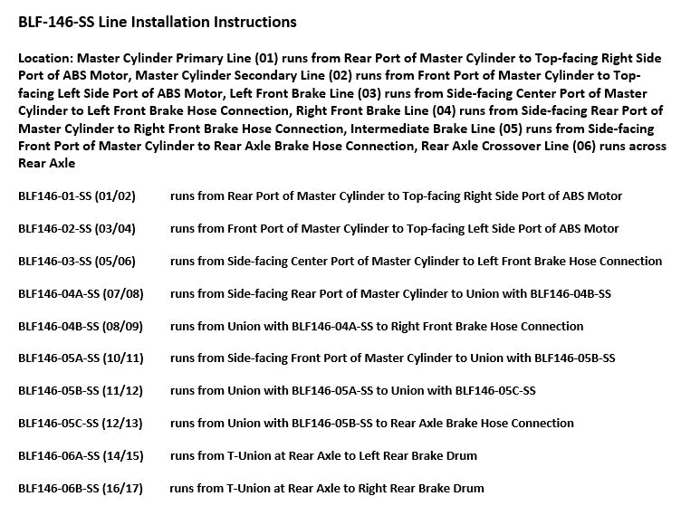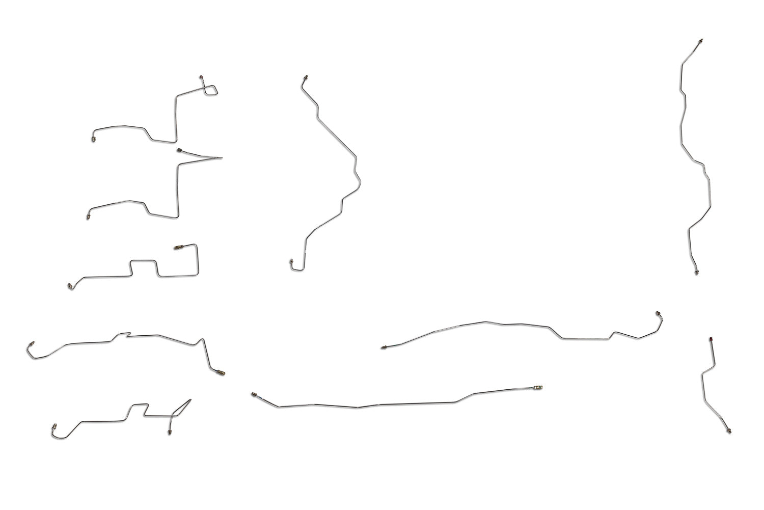 1 Master Cylinder Primary Brake Line 3/16", 1 Master Cylinder Secondary Brake Line 3/16", 1 Left Front Brake Line 3/16", 1 Right Front Brake Line 3/16" (in 2 easy to install sections), 1 Intermediate Brake Line 3/16" (in 3 easy to install sections), 1 Rear Axle Crossover Line 3/16" (2 sections), Does NOT include Brake Hoses